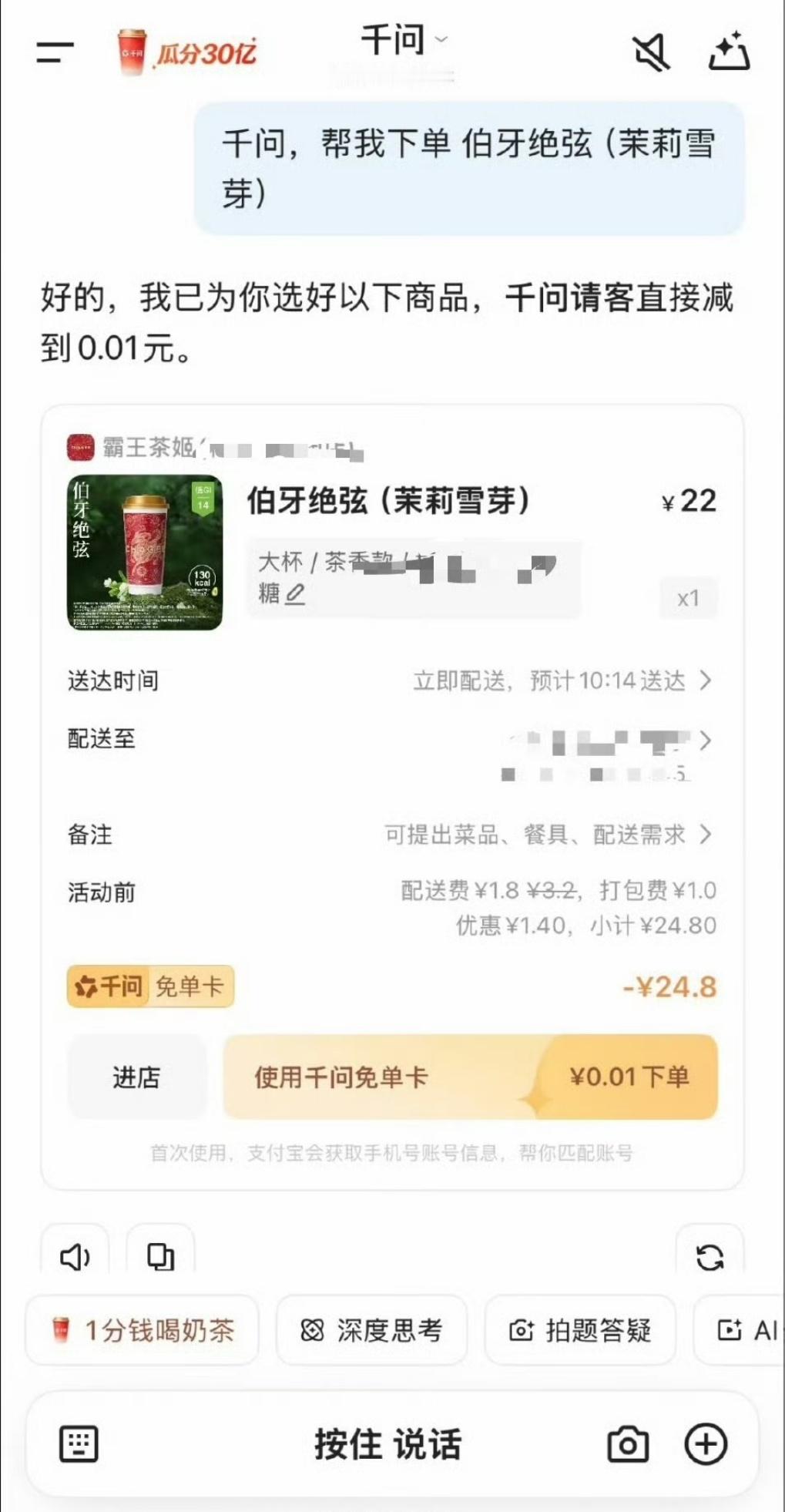 免费的奶茶,谢谢千问,已经美美喝上了🧋