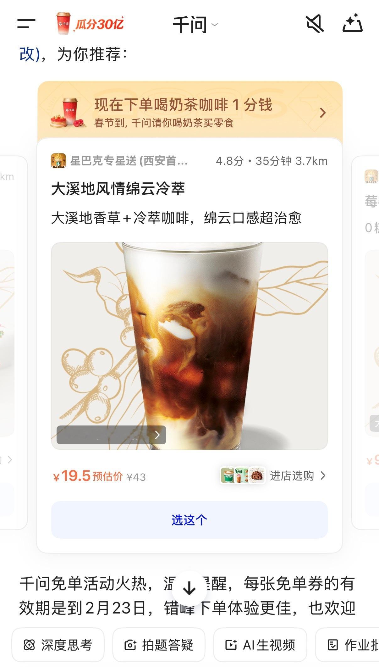十大奶咖品牌求AI翻牌千问这波赢麻了,早上点了霸王茶姬,中午点了星巴克,都享受到了优惠……虽然还是老套路,砸钱补贴,但是大家都用着很开心。