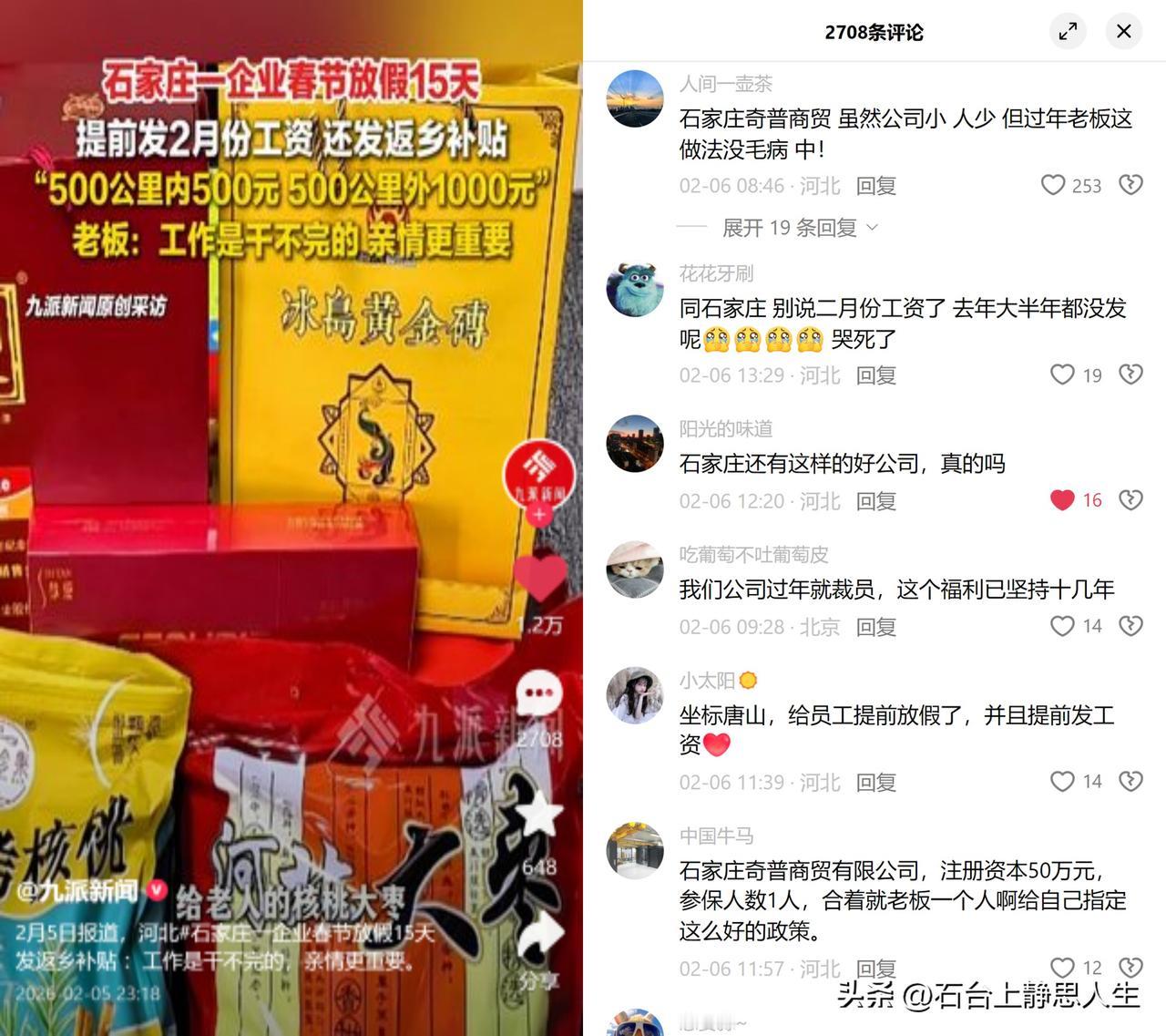 石家庄一公司放15天春节假 不仅提前发了2月份全额工资,还给500到1000元的返乡补贴,500公里以内补500,以外补1000,白酒、香烟、花生油这些年货也管够。老板就一句话:工作是干不完的,亲情更重要。 这事儿在网上火了,有人喊神仙公司,也有人怀疑是不是炒作。但说实话,在这个大家都被KPI追着跑的年代,这样的操作太稀缺了。 看看身边的职场常态:假期缩水是常事,工资拖仨月的也有,过年加班更是不少人的宿命。尤其是小公司,生存压力本来就大,能掏出真金白银给员工谋福利,这份格局真的够亮眼。比起那些天天画大饼的老板,这种把员工当回事的,才是真的懂人心。 多少打工人刷到这消息时,心里偷偷酸了一下?