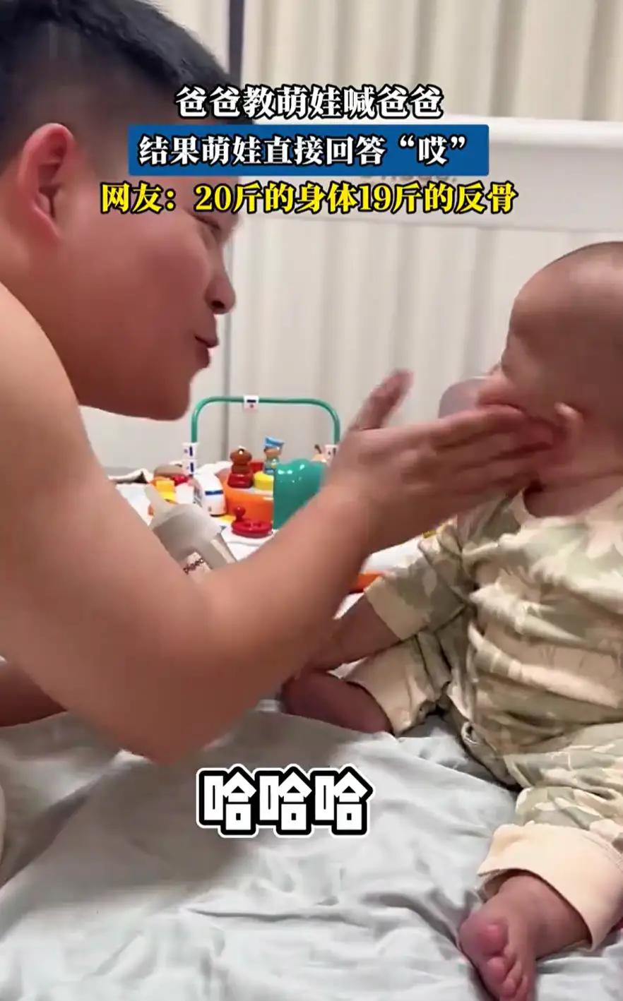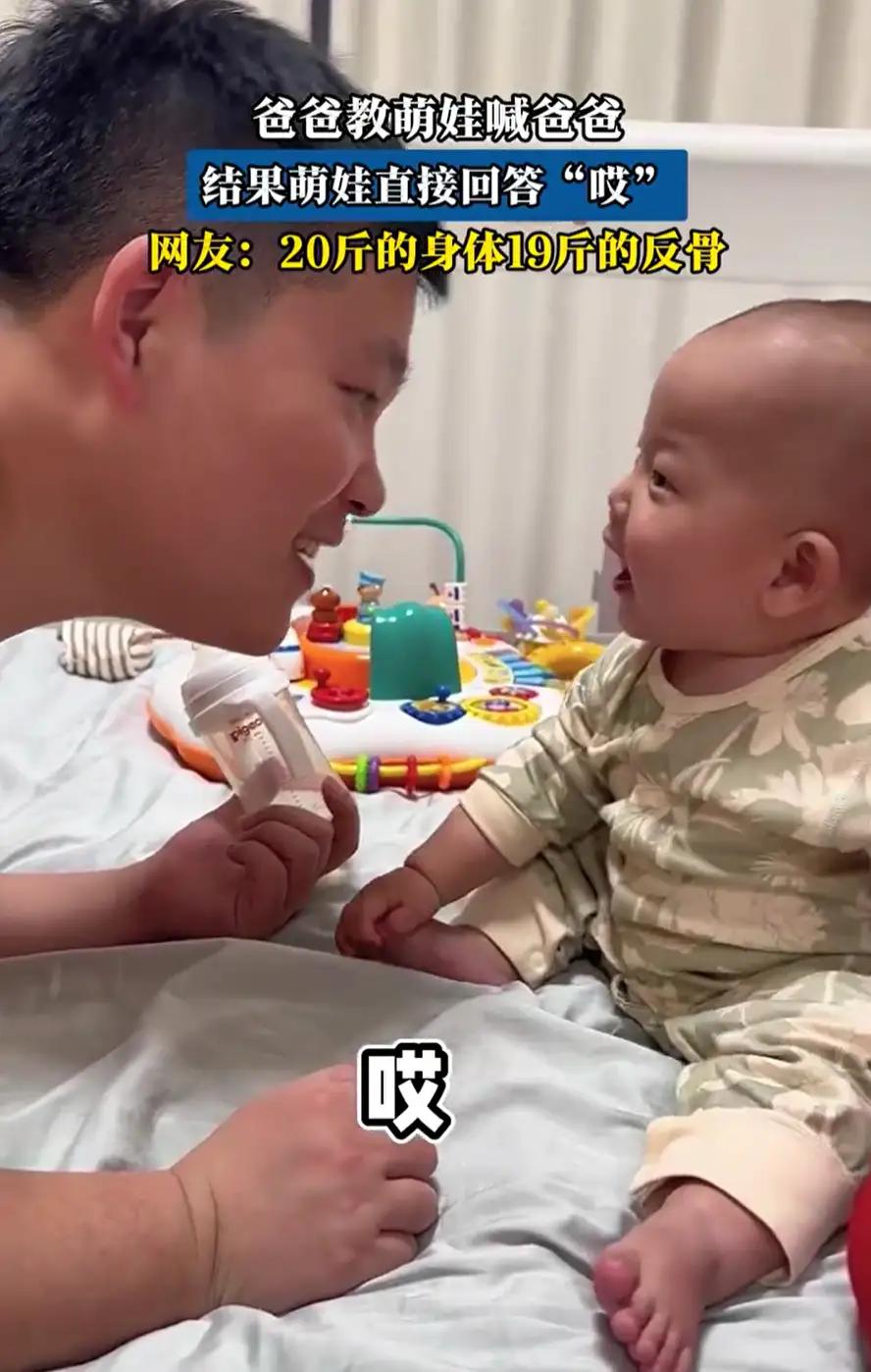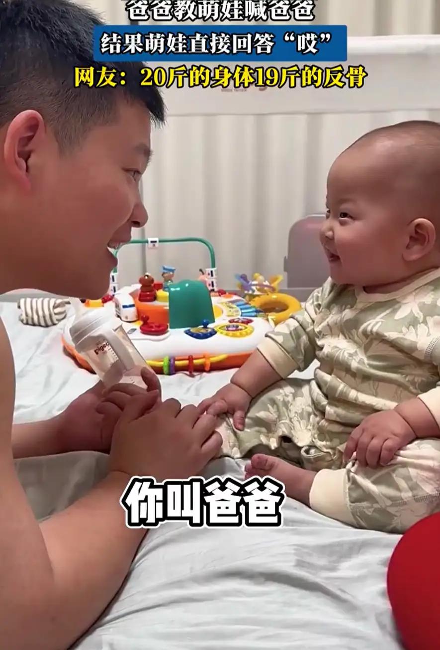 上海,一男子在家里教宝宝喊爸爸,没想到,自己每教一句“爸爸”,宝宝就“哎”一声,话不但没教会,反而让孩子占了自己的便宜,男子也是哭笑不得。网友:20斤体重有19斤反骨。 画面中,男子坐在床边对着孩子,一字一句地示范:“宝宝,看着爸爸,跟我念——爸爸。”话音刚落,还没等他继续引导,小家伙便眼睛亮晶晶地望着他,脆生生地应了一声:“哎!” 男子愣了一下,随即失笑,以为宝宝只是巧合回应。他耐着性子再次重复:“爸爸。”没想到宝宝依旧秒接:“哎!”这一次,小家伙还得意地挥了挥小拳头,像是完成了什么了不起的任务。如此反复几次,男子每教一句“爸爸”,宝宝就精准接上一声“哎”,节奏拿捏得死死的。 原本严肃的教学现场,渐渐变成了宝宝的占上风现场。男子看着宝宝一脸无辜又得意的模样,既无奈又好笑,嘴角抑制不住地上扬,最后干脆放弃教导,抱着宝宝笑作一团。那哭笑不得的神情,完美诠释了搬起石头砸自己脚的育儿日常。 网友调侃道:“这孩子绝对是天选反骨仔,20斤的体重里藏着19斤的反骨!”还有网友留言:“奶爸内心OS:教了个寂寞,还凭空多了个‘儿子’?”更有同款家长感同身受:“同款娃,教啥都反着来,主打一个叛逆式可爱。”