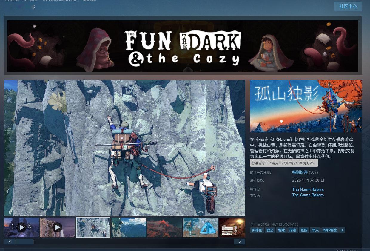 生存攀岩游戏《孤山独影》发售首周销量突破30万份,Steam平台首发优惠价97.2元,2月13日截止,支持中文,国区好评率86%,收录567篇玩家评测。