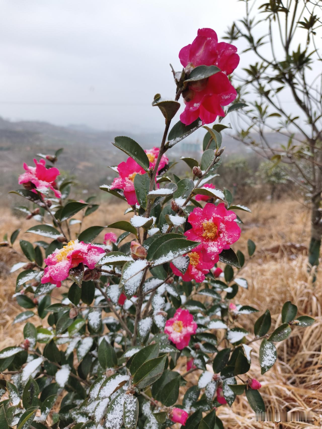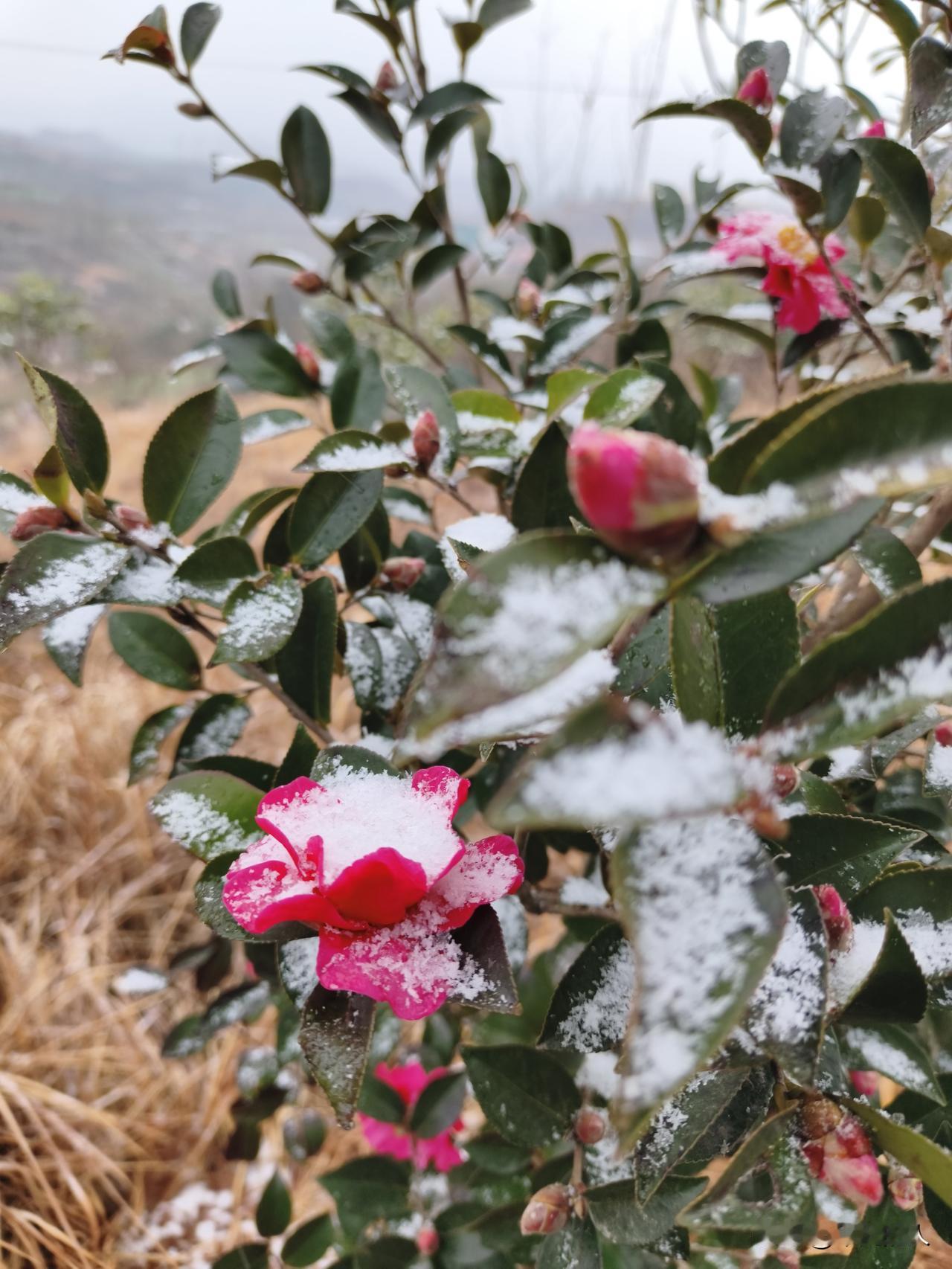 下雪天在外面溜达,随手一拍,竟邂逅了雪中绽放的茶花。那茶花在洁白雪的映衬下,红得
