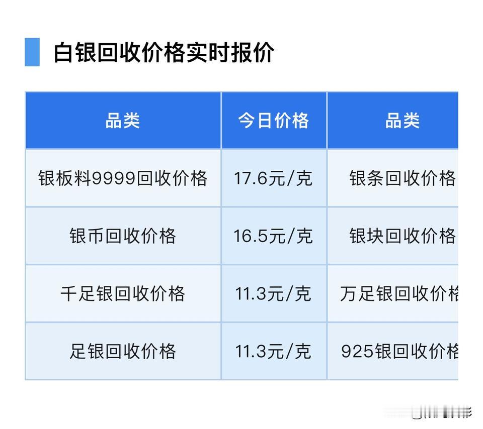 今日银价!以及白银回收报价查看! 随着黄金价格的上涨,银价也跟随上涨,对于想购买白银的人来说,了解今日银价是很重要的。 那么先来看看,现在白银回收报价是多少钱一克了? 银板料9999回收价格17.6元/克,银条回收价格16.5元/克,银币回收价格16.5元/克,银块回收价格16.5元/克,千足银回收价格11.3元/克,万足银回收价格11.3元/克,足银回收价格11.3元/克,925银回收价格9.3元/克。 同比于昨天白银回收各品种报价相比较,今天白银回收各品种报价都整体下跌了4元/克 今日白银价格17.8元/克,银饰零售价格每克19至39元区间。 在购买银饰或者制品时,价格会因为设计、工艺和品牌等因素有所不同,另外银价也是每天变化的。 根据黄金价格网消息:2026年2月6日亚盘,现货黄金一度跌超2%下探至4655.31美元,现货白银一度跌超9%下探至63.92美元,进入10点之后,在逢低买盘支撑下,金价银价触底反弹上涨,现货黄金重回4800美元上方,现货白银重回70美元上方。 短期内,若美元继续维持强势、地缘谈判保持积极进展,贵金属仍有测试更低支撑的风险。 对于长期投资者而言,下跌反而提供了更好的布局时机 实物白银怎么购买: 1,购买渠道:银行,提供投资性银条(如各行如意银)、纪念银币等。 2,金店:销售银条、银币、银饰等,注意选择纯度标识清晰(如999)的产品。 买银小知识:首先讲两个概念。 1,纯银:银含量达到92.5%就可以称为纯银了。(例:淘宝925纯银项链5) 2,足银:银含量达到99%才能称为足银。足银又分为纯度为99%(钢印为 Ag990、足银990,99.9% (Ag999、足银999),99.99%(Ag999.9、足银999.9)。 我们平时想投资银,一定要买Ag999.9的,其他的都会在大盘价的基础上打折较多。如果只标注了足银,是没法看出来含量的。 另外如果钢印标注了SL (包银),FS(镀银),都是假首饰,不值钱。当然即使钢印正确也不代表一定是真的,但连标注都没有的更假! 再来分享个白银回收怕踩坑,记住这3点,肯定能守住你的钱袋子。 第一:要了解当天的大盘银价,因为回收价是在大盘银价基础上减掉几毛钱。 第二:回收不看品牌样式,更不会看付款记录和小票,只看纯度和克重。所以千万不要被无良商家压低价格。 第三:回收前最好自己先称重量,反复多称几次,避免和商家扯皮。误差在1g和0点几克属于正常情况,但如果误差太多,那你可要小心了。 所有信息,都只是提供参考价值! 投资有风险,理财需谨慎! 银首饰价格 银价 银块回收价格表 银条回收价格 银料回收价格 银料价 银块收购