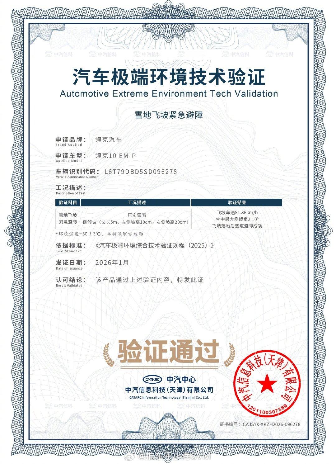 在第二项测试中,领克10 EM-P从长度5米、左侧坡高10厘米、右侧坡高20厘米的侧倾雪坡飞跃而下,模拟在雪地驾驶突遇斜坡与障碍的危险情况。实测飞坡车速达到了81.86km/h,空中最大侧倾角2.10°,飞坡落地后悬架响应迅速,丝滑变道避障成功,全程没有出现打滑溜车、甩尾失控等情况。在冬天尤其是冰雪天,就怕出现打滑情况,看得出来领克的操控相当不错。
