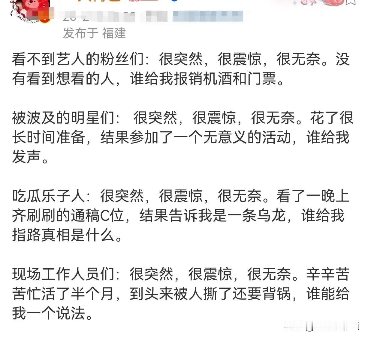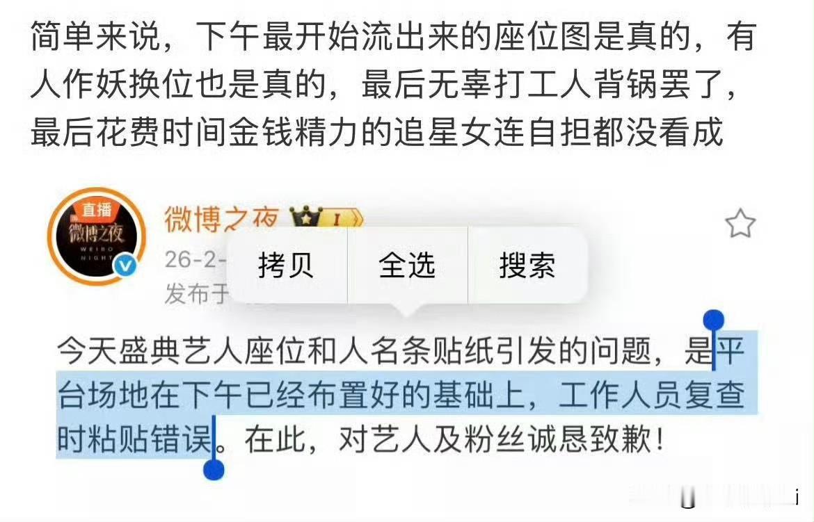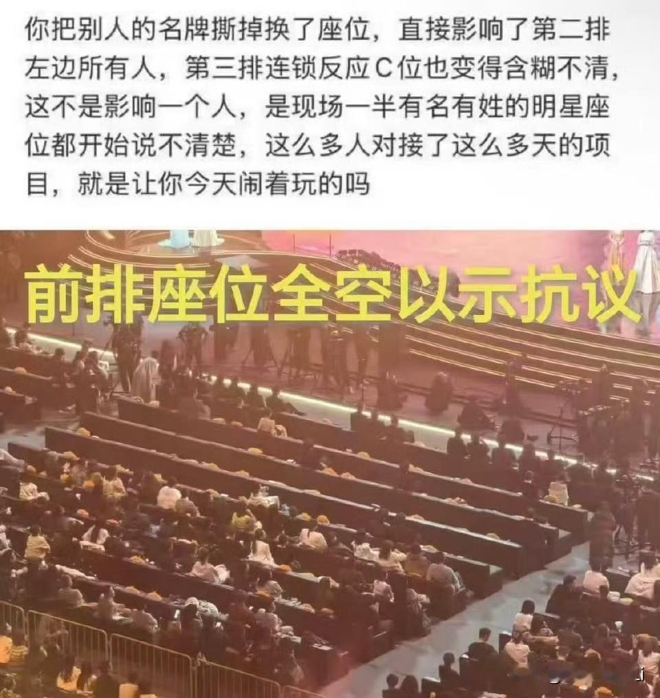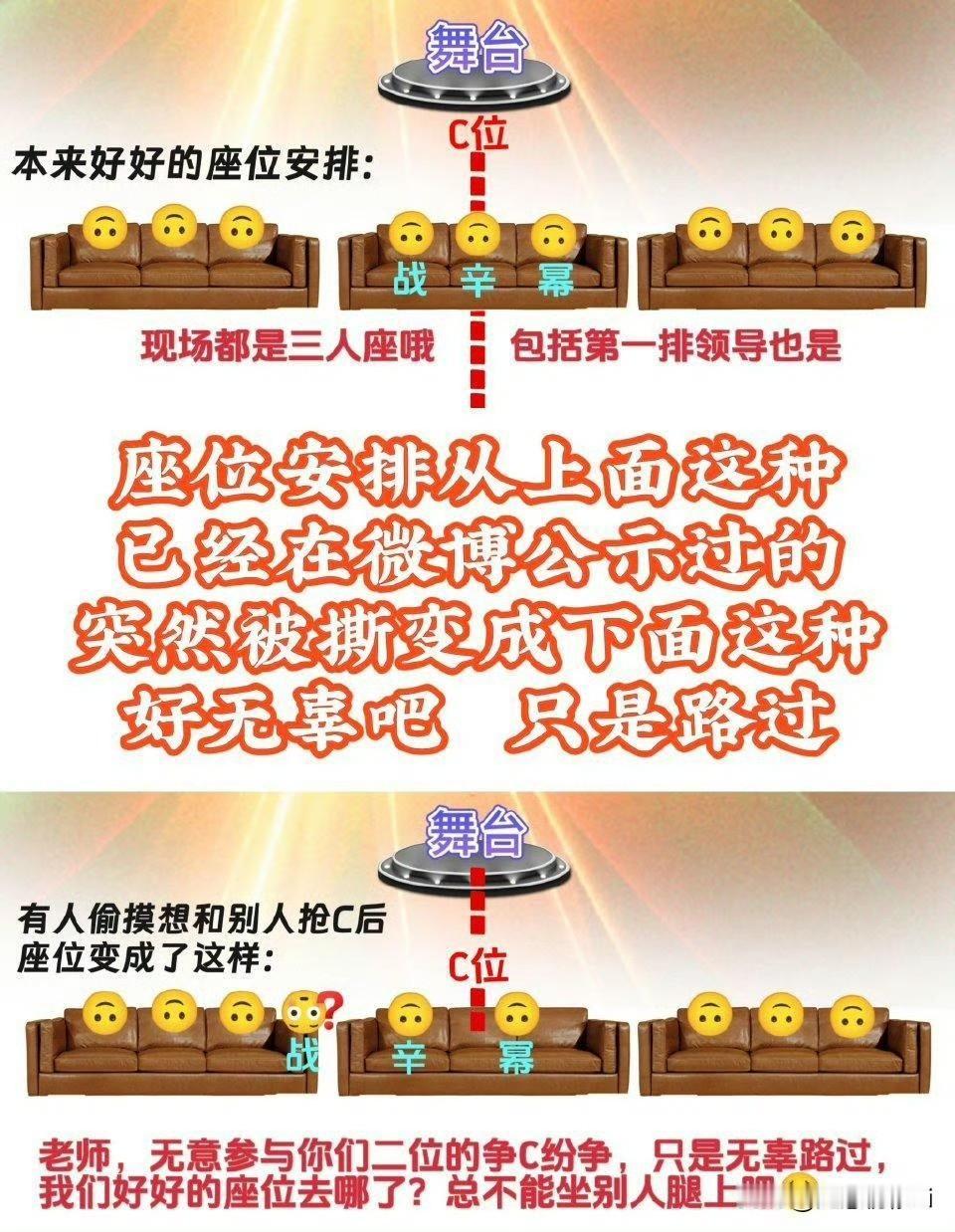 肖战昨天无妄之灾,有人为了争c位,撕掉了肖战的座位名牌,贴到了旁边的座位上,原本以1号女星为主位的c位偏离,变成了两女星双c。现场所有的沙发都是三人位,导致肖战的座位变成了4人,太过拥挤无法入座。而且因为撕掉肖战的名牌,导致左侧和234排所有的明星位置都偏离,咖位不清,所以234排座位基本全空,无人入座。 微博虽然拿工作人员顶锅道歉,把肖战的座位恢复原样,但谁是既得利益者谁最清楚,谁在撒谎,导致整场晚会 全场远道而来的各家粉丝看不到偶像,全场大喊退票。 肖战还被女星粉丝辱骂造谣,甚至抽227奖跨🔥盆狂欢,简直令人发指。 肖战被莫名被牵连,粉丝澄清是必须的,不要让女星粉丝和黑子颠倒黑白。 去现场的肖战粉丝千里迢迢为肖战而来,屏幕前的粉丝日夜打投为了看肖战,肖战无法入座,看不到自家偶像生气发牢骚在所难免,粉丝也是消费者,但是要对内娱恶性竞争说不。 肖战是体面人,但不是没原则。 谁撒谎撕C位,谁以后播剧大扑特扑,以此为证[加油] 小飞侠只负责澄清,澄清图铺满全网,以防有人倒打一耙