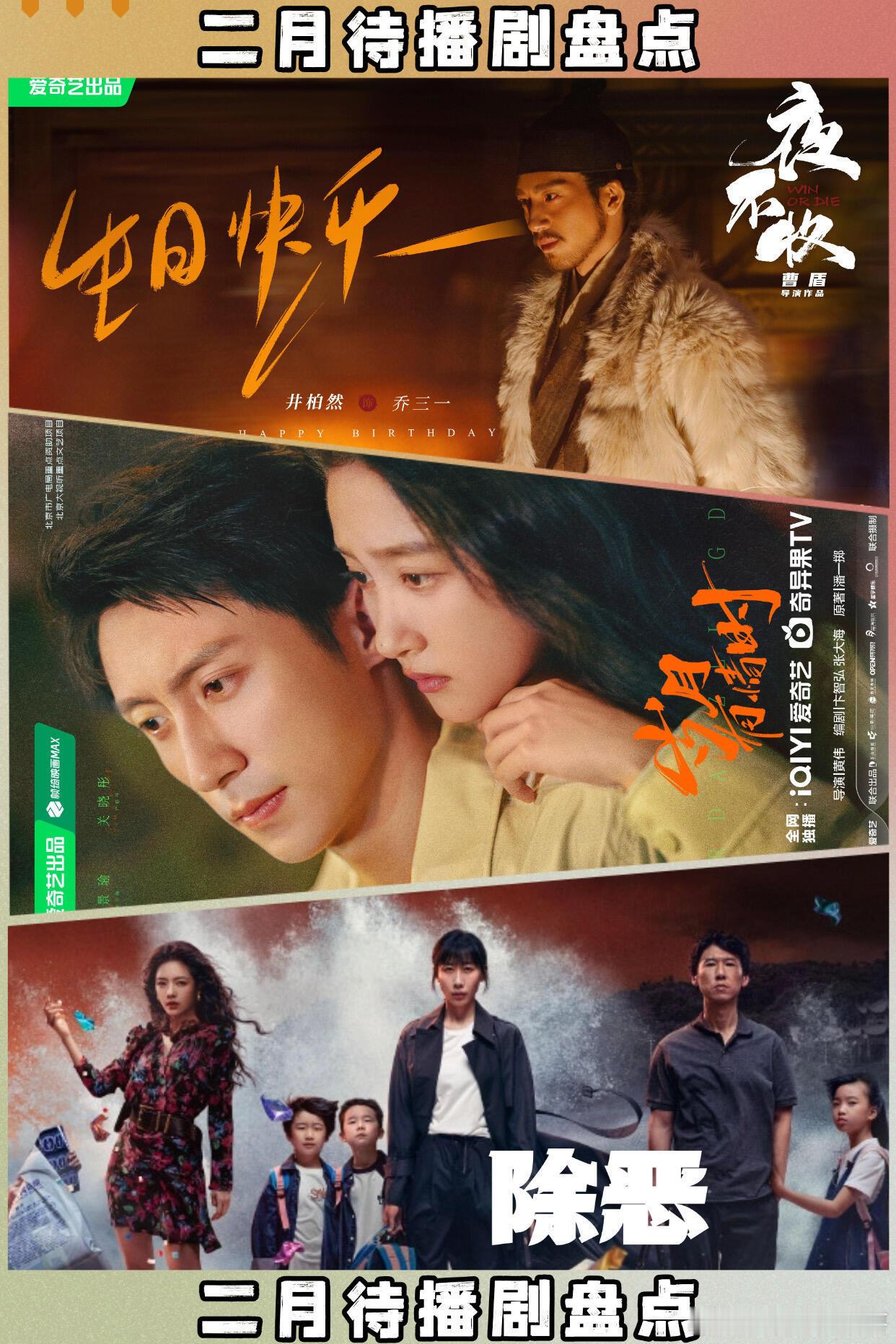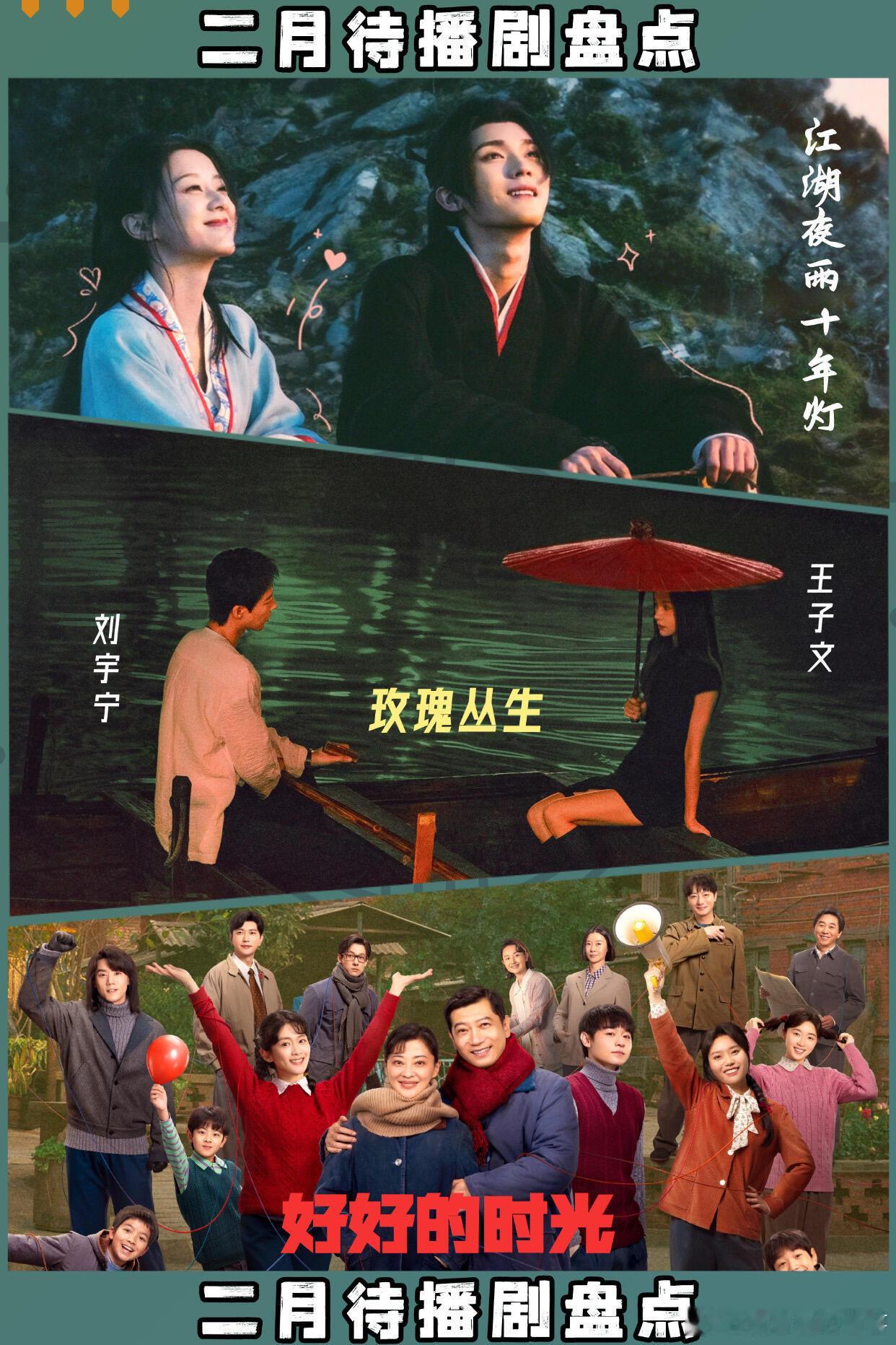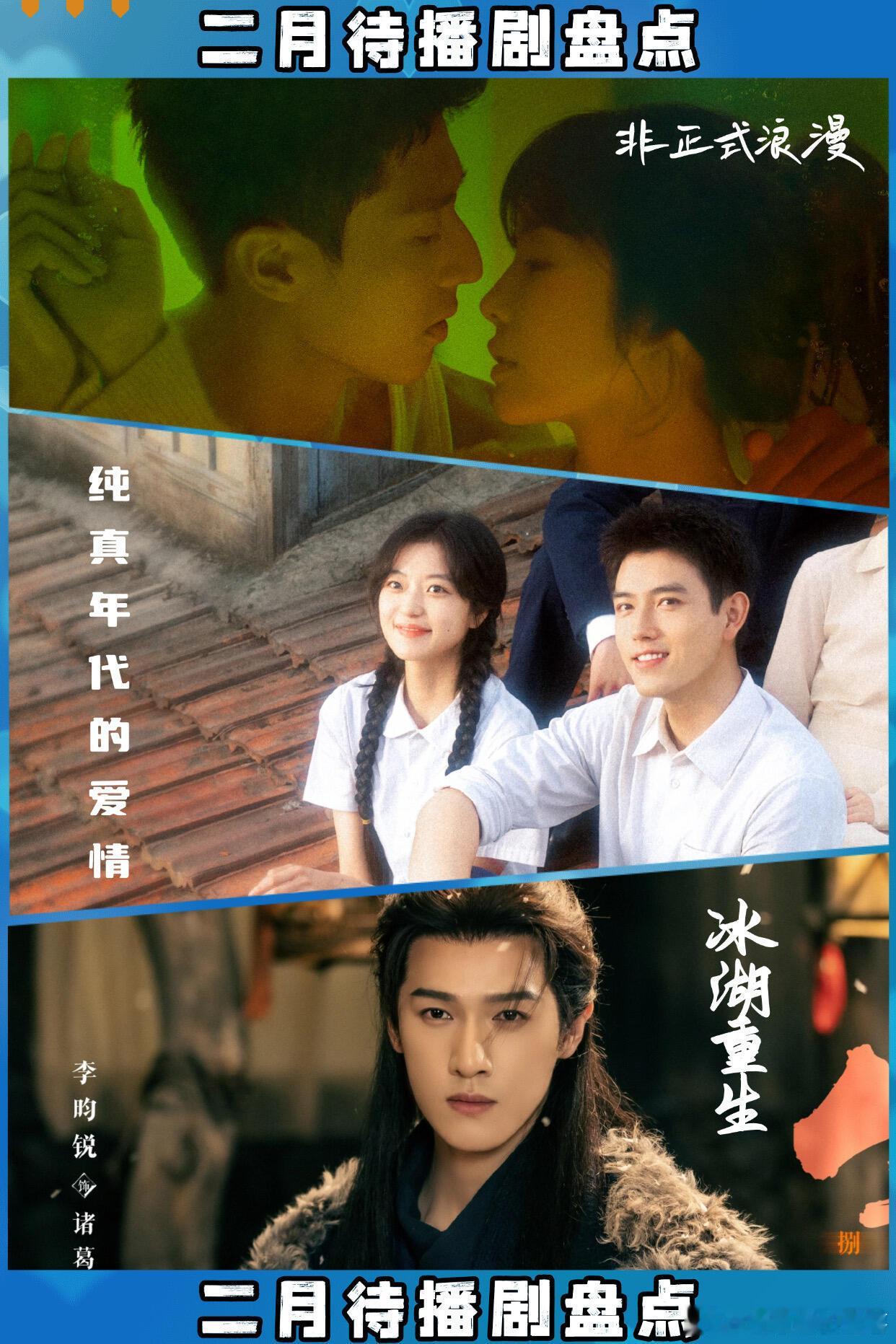 2月份在播剧◾︎《女神蒙上眼》辛芷蕾、林雨申◾︎《有罪之身》孙千、魏大勋◾︎《夜色正浓》江疏影、佟大为◾︎《生命树》杨紫、胡歌◾︎《年少有为》彭昱畅、林允◾︎《风过留痕》龚俊、姜武 今晚开播!.[火R]已定档待播剧2.05《唐宫奇案之青雾风鸣》白鹿 王星越2.06《成何体统》王楚然 丞磊.网传2月定档:2.15《夜不收》井柏然 吴幸键2.18《岁月有情时》黄景瑜 关晓彤2.27《除恶》任素汐 王骁2.27《非正式浪漫》蔡文静陈靖可2.5《冰湖重生》李昀锐 黄杨钿甜2.20《纯真年代的爱情》陈飞宇 孙千2.23《江湖夜雨十年灯》周翊然 包上恩2.27《玫瑰丛生》王子文 刘宇宁 蒋欣2.16《好好的时光》梅婷 田雨.各平台其余待播剧:👖《千香》鞠婧祎 宋威龙 裤《势在必行》郭京飞 李乃文 裤《烽影燃梅香》王楚然 李宏毅 裤《乡村爱情18》赵本山 裤🥝《云归喜事》张云龙 张佳宁《遮天》尹正 祝绪丹《醒来》欧豪 古力娜扎《你好1983》周也 翟满闻《主角》张嘉益 刘浩存🐧《重返青春》蔡明 李诚儒《我的妈妈是校花》邓恩熙 蒋龙《待我醒来时》景甜 张新成,🥭《欢聚》李兰迪 此沙《祯娘传》杨紫 韩东君