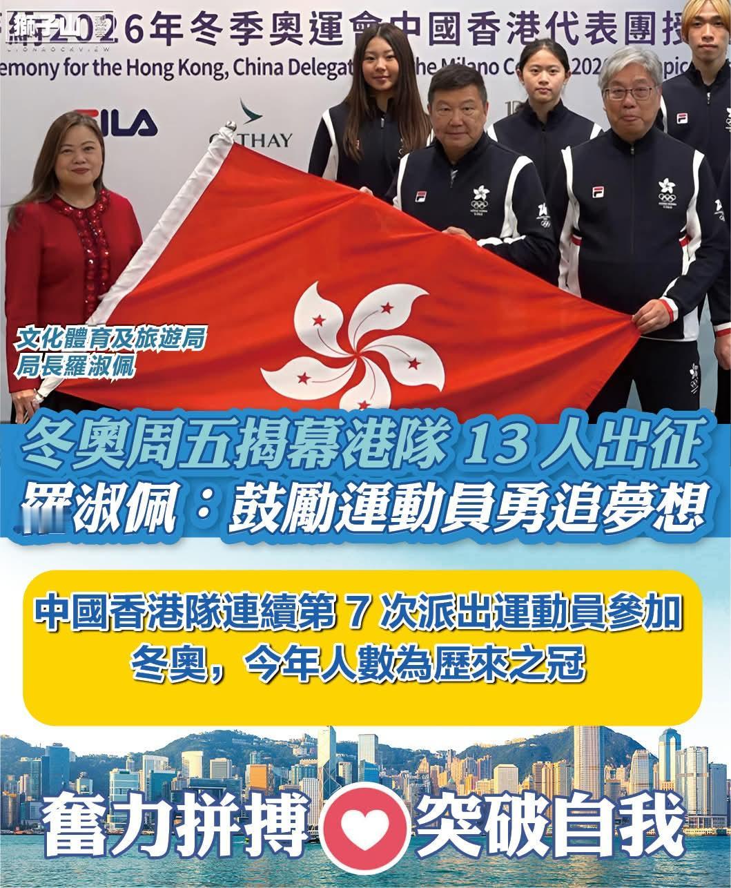【冬奥週五揭幕港队13人出征 人数为历来之冠】 第25届冬奥今天,即週五(6日)揭幕,由义大利两个城市米兰及科尔蒂纳一起主办,共设16个大项赛事,来自超过90个国家和地区、约2900名运动员参与。中国香港将派出13人代表团参与,今年是中国香港队连续第7次派出运动员参加冬奥,4名运动员将参加短度速滑和高山滑雪项目,当中有资深的战将,也有首次参赛的新星,包括4名运动员,翁厚全、金咏晞将出战高山滑雪项目,郭子峰、林静欣则参与短道速滑项目,人数为历来之冠。 港队郭子峰金咏晞担任开幕礼持旗手,而中国代表团旗手将由速度滑冰男子运动员宁忠岩和短道速滑女子运动员张楚桐担任。高sir在此为国家队及中国香港队打气!鼓励各运动员奋力拼搏、突破自我、勇敢追寻冬奥梦想。