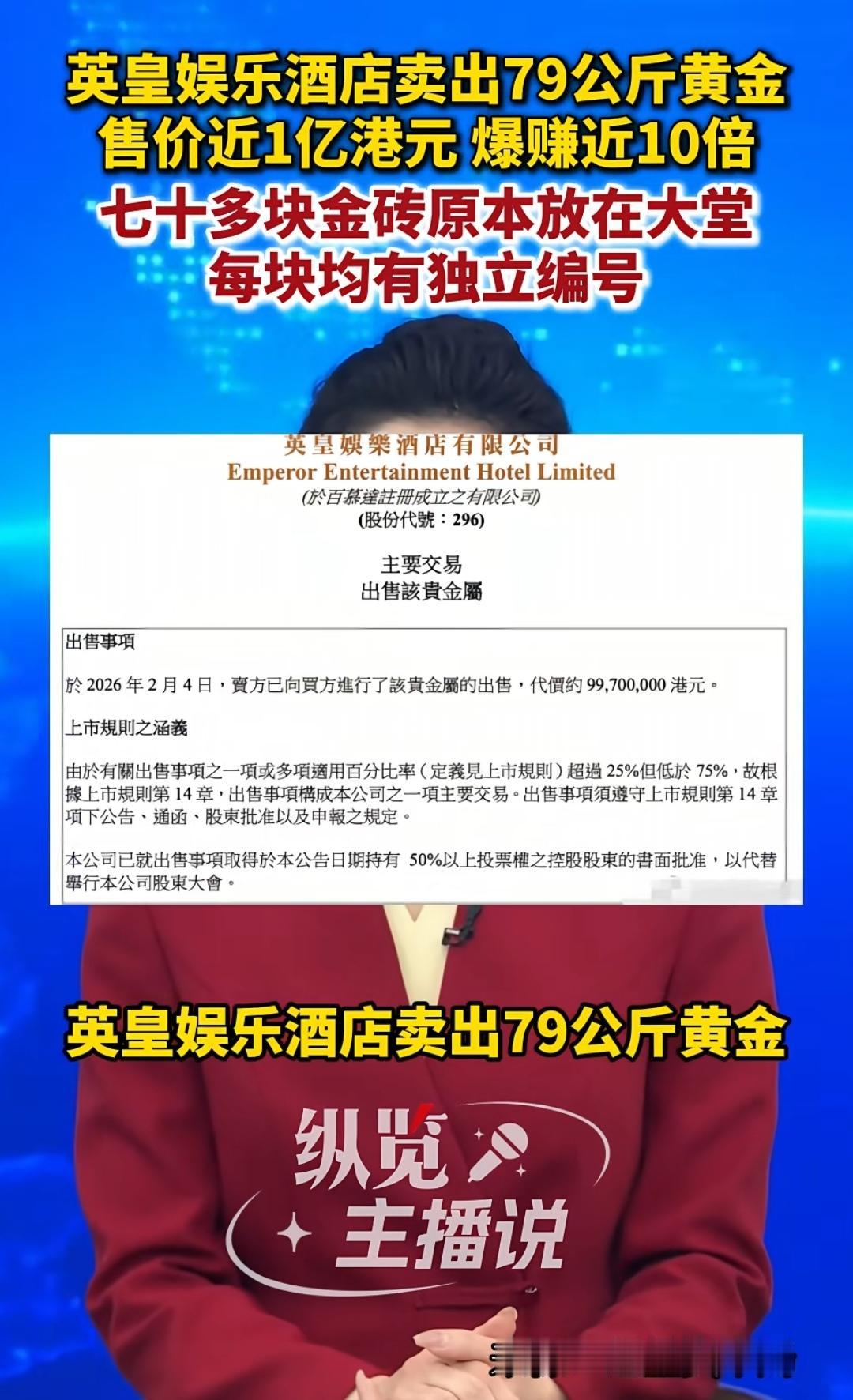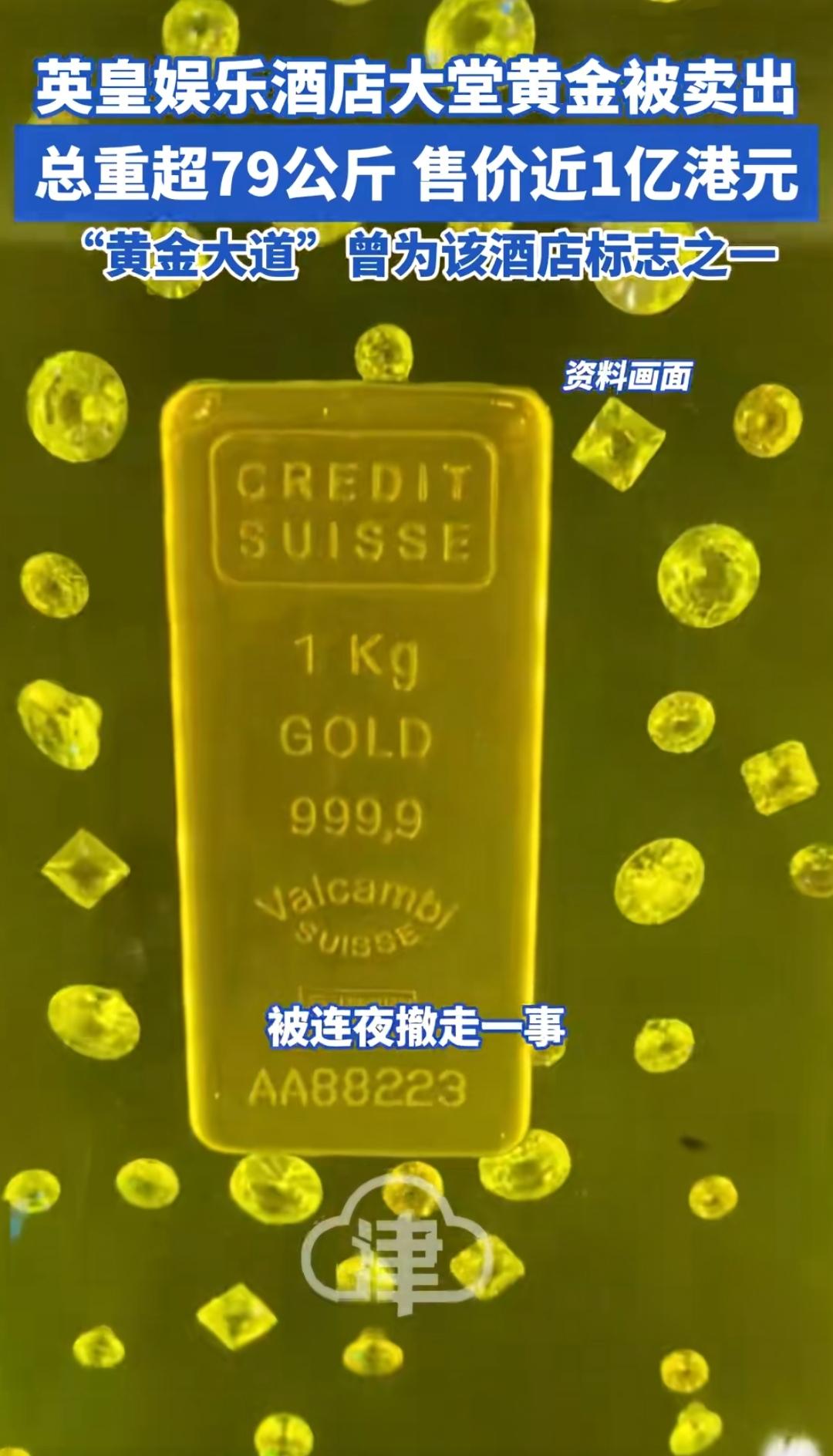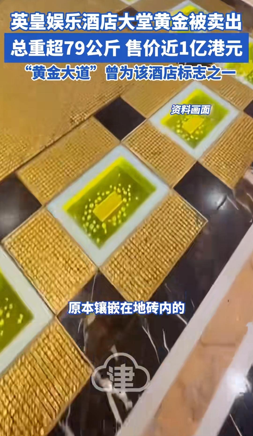 酒店内黄金大道被售出,名利双收。 (如图所示)黄金价格高涨,惹得不少趁机人获利了结,其中英皇娱乐酒店把其标志性建筑,组成酒店内黄金大道的七十多块金砖尽数售出,总重量79公斤,总价值近1亿港元,获利至少十倍,这黄金大道的广告效应十足,酒店名利双收。