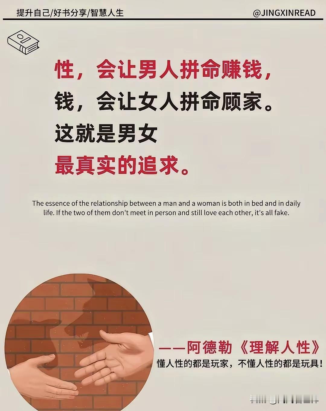 性,会让男人拼命赚钱, 钱,会让女人拼命顾家。 这就是男女最真实的追求。