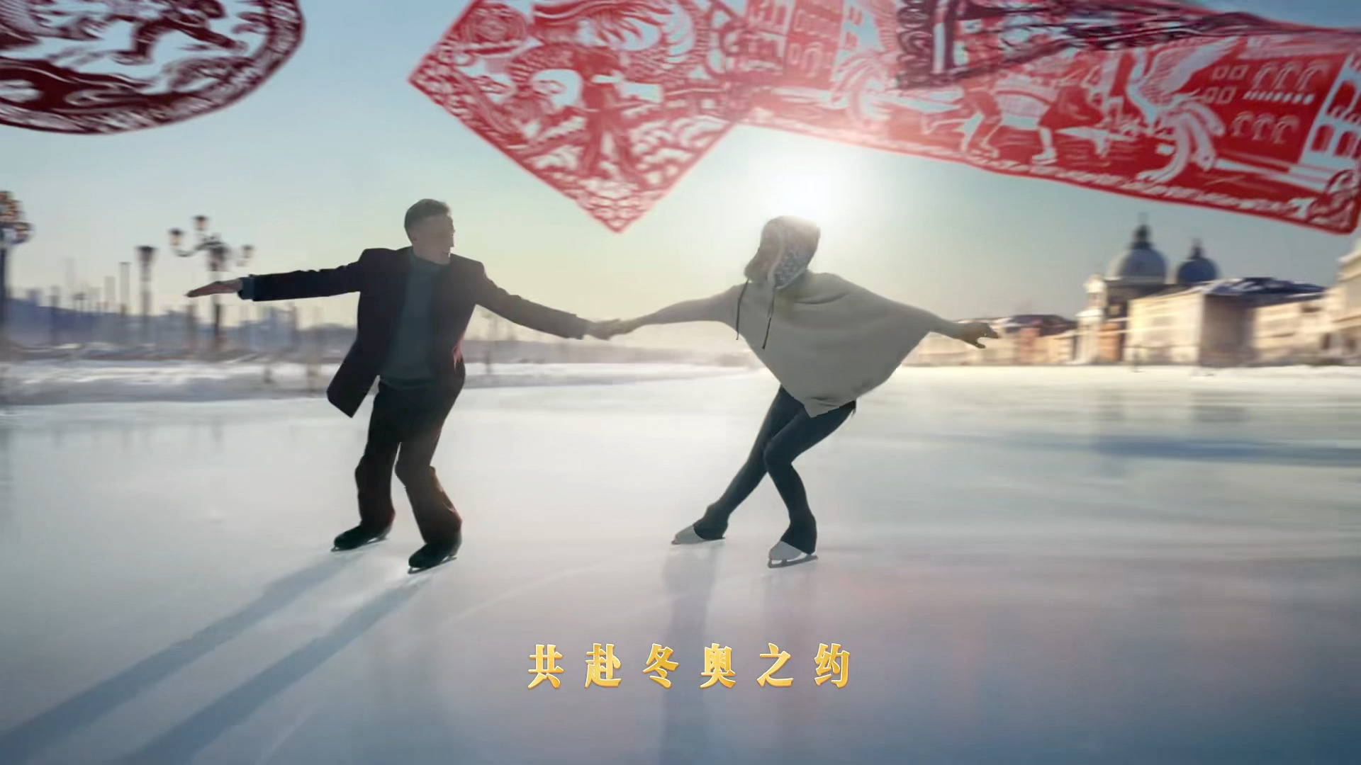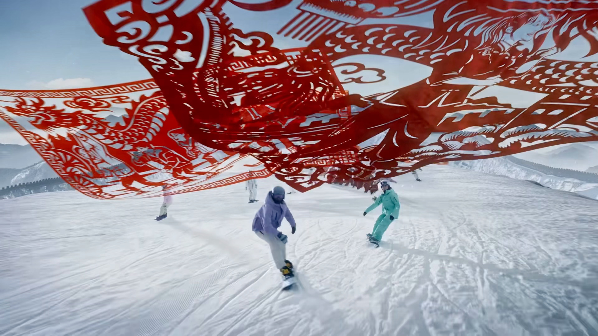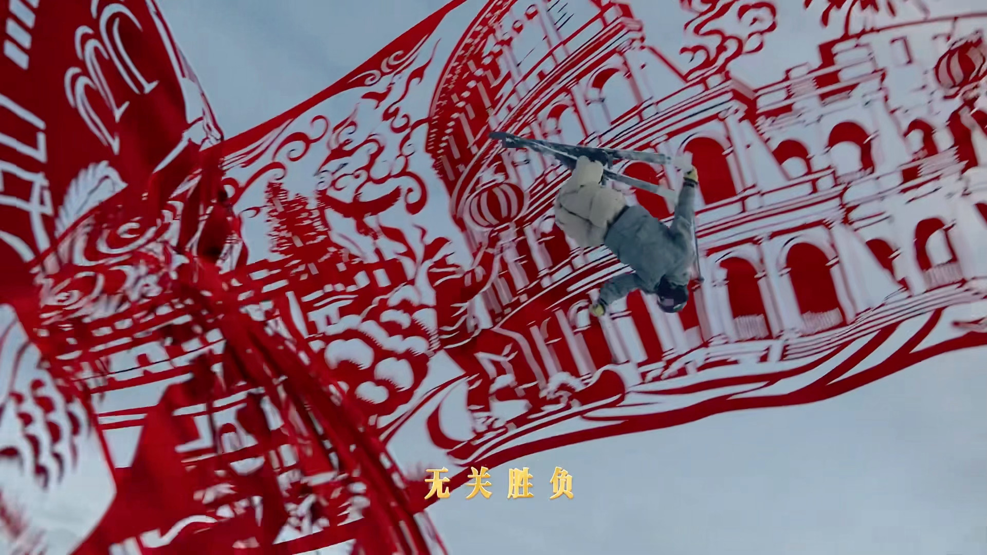 短片用极简画面承载宏大意境,色彩唯美又呈现了不同冰雪运动。画面中色彩与仪式感交织,人物、剪纸、冰雪场景等元素层层叠加,形成了视觉节奏与情感共鸣。运动员滑雪掠过剪纸,光影映射出的巨型“春”字,都将中国春节的喜庆与冬奥冰雪精神巧妙连接,张艺谋再次将他的中式美学延伸。