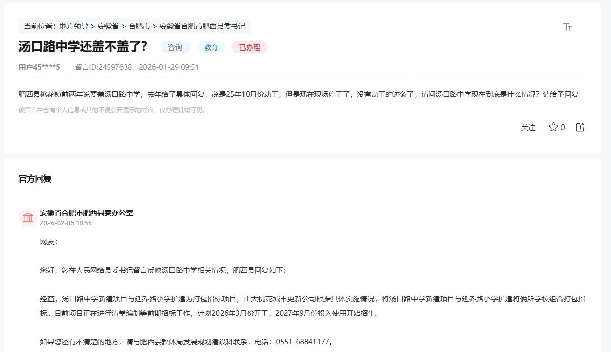 合肥肥西繁华大道西,汤口路中学还盖不盖了? 官方回复,计划2026年3月份开工,2027年9月份投入使用开始招生。 繁华大道西这一带,二手房成交的多,当然也是便宜,几十万一套。在一个县里买三四十层的房子,是需要勇气的,但是在绝对的价格面前,都是值得买的,何况这里地理位置还好。