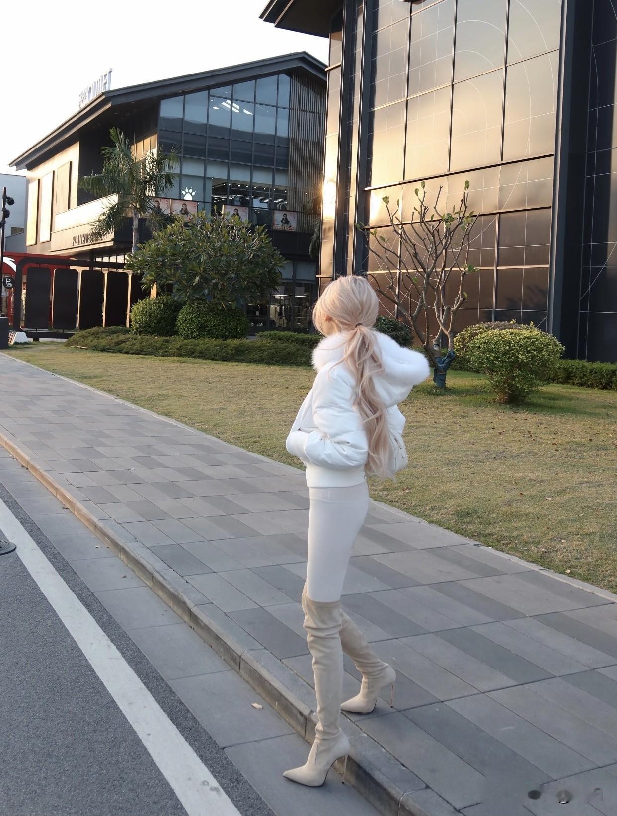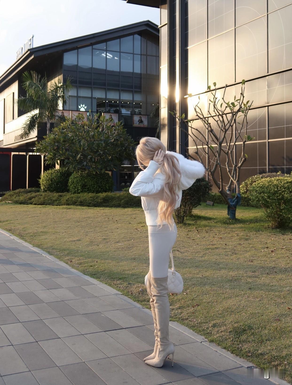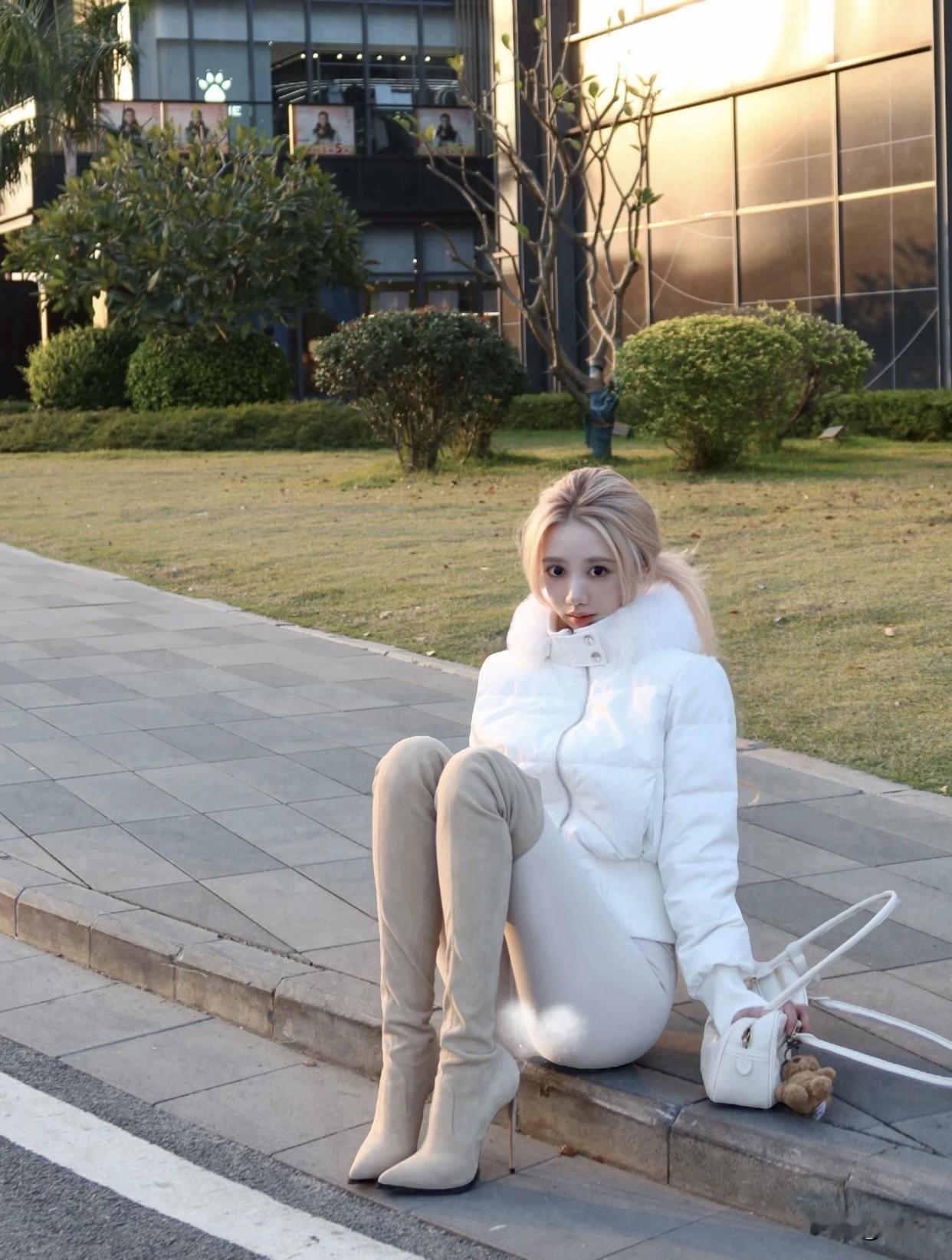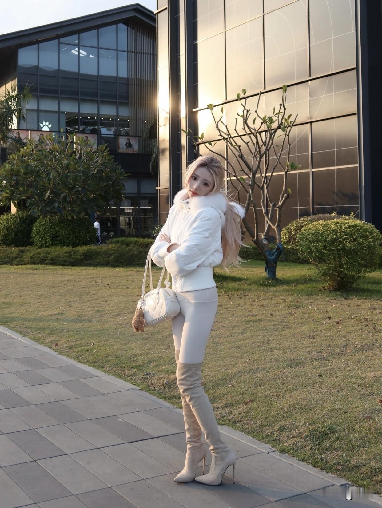 冬日暖阳下,优雅白衣搭配高筒靴,尽显都市女性魅力。