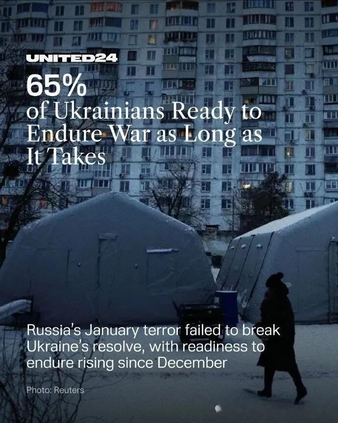 基辅社会学研究所的最新民调显示,即便在寒潮侵袭下遭到俄罗斯军队的猛烈轰炸,但乌克兰人坚持下去的决心却比12月提高了2%,达到了65%。