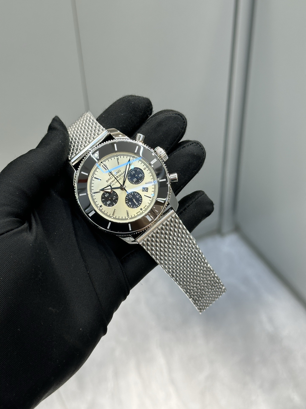 百年灵家族的“水鬼”-超级海洋文化二代42mm腕表,采用高分子耐磨陶瓷制成的表圈,经久耐磨,陶瓷圈下面是120齿设计的单向旋转精钢外圈,用尖端卓越的CNC数控机床精雕加工再进行抛光处理,配件精密度超越一切平常,原装开模。造型独特的指针带有超强夜光