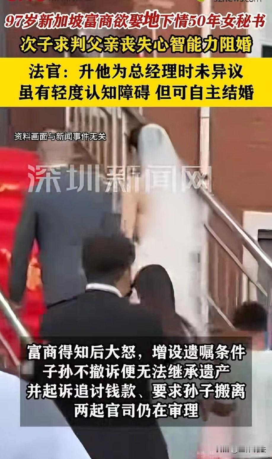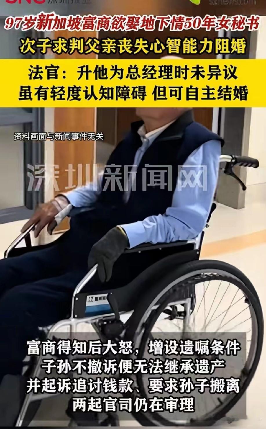 太双标了!97岁的富商和女秘书保持了50余年的地下关系,为了人生不留遗憾,富商决定再婚娶女秘书。可谁知,儿子得知这一消息后,直接把老父亲告上法庭,认为父亲2017年跌倒后,患有失智症,请求法院认定他心智不全,不能结婚。法院:2019年富商把儿子升为公司总经理时,儿子怎么不说他心智不全呢?儿子的用意太明显,法院直接驳回诉求。 现年97岁的富商,心里藏着一个五十多年的执念,他和自己的女秘书,悄悄维持了五十余年的地下关系。 这大半生里,两人相互扶持,富商早就把女秘书当成了生命里最重要的人。 眼看着年事已高,富商不想人生留下遗憾,一心想着给对方一个名正言顺的身份,于是在2021年,时年92岁的他下定决心,要和女秘书正式结婚,把这段地下情修成正果。 可让富商没想到的是,这个决定刚告诉家人,不仅没有得到家人的支持和祝福,反而遭到了次子的强烈反对。 儿子得知父亲要再婚的消息后,实在不愿意接受父亲再婚的事实,更担心这会影响到自己的利益,思来想去,竟然想出了一个阻止父亲的办法。 儿子跑到新加坡法院,提交了一份申请,要求法官裁定父亲丧失心智能力,没办法为自己的人生大事做独立决定。 法庭上,儿子声称,父亲在2017年9月在家中跌倒后,心智能力就大不如前,很可能患上了失智症,根本没法清醒判断婚姻这件事。 在他看来,只要法院认定父亲心智不全,这场再婚自然就成不了。 然而,法院在审理过程中,很快就发现了其中的蹊跷。 法官注意到一个关键细节:2019年的时候,富商还特意把次子升为了公司总经理,当时儿子不仅没有提出任何异议,反而欣然接受了这个职位,压根没说过父亲心智有问题。 这一前后矛盾的行为,让儿子的真实用意暴露无遗。 法官心里很清楚,儿子现在突然说父亲心智不全,根本不是真的关心父亲的身体状况,而是怕父亲再婚会影响到自己的继承权和在公司的利益,说白了就是私心在作祟。 这种“需要父亲时就认可其能力,不利于自己时就否定其心智”的双标做法,显然站不住脚。 官司历经五年,2026年1月,新加坡法院作出了最终裁决,直接驳回了富商次子的诉求。 法院明确认定,现年97岁的富商精神状态良好,具备自主判断和决定婚姻的能力,完全可以按照自己的意愿选择再婚。 面对法院的驳回,富商的次子并没有放弃,目前他已经就这份判决提起了上诉,想要继续阻止父亲的婚事。 这场跨越半世纪的感情能否顺利修成正果,还要看后续上诉的结果,不过无论如何,法院的一审判决已经戳破了儿子的私心,也让富商追求晚年幸福的权利得到了维护。 富商次子的行为堪称“双标”的典型,其本质就是为独霸财产而牺牲父亲的婚姻自由。 父亲2019年提拔他为公司总经理时,他对父亲的心智能力毫无异议;如今父亲要迎娶相伴半世纪的女秘书,便突然声称父亲失智,妄图通过法律手段阻止再婚。 儿子的私心昭然若揭,无非是害怕父亲百年后,女秘书依法分割遗产,损害自身既得利益。 婚姻自由是公民的基本权利,即便年届九旬,富商仍有权追求晚年幸福。 儿子以“关心父亲”为幌子,行争夺财产之实,既违背人伦孝道,也无视法律底线,最终被法院驳回诉求,实属情理之中。