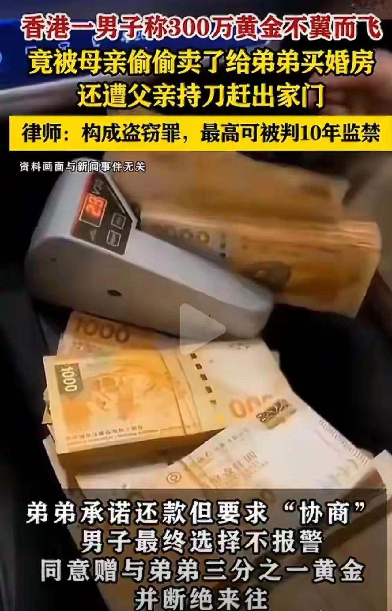 这事儿听着就让人心里堵得慌。那个香港男的,从十几岁开始就省吃俭用攒钱买黄金,每月一点点,工作了还坚持买“半两金粒”,整整十五年。那些金粒是他全部心血,值三百万港币,就收在家里的保险箱。 结果最近金价高,他想卖掉一部分,一开箱——全没了。 问他妈,人家特淡定就认了,说偷偷卖了,钱全拿去给小儿子付婚房首付了。这男的当时就懵了,气得不行,结果他妈来了句:“你弟弟结婚得用钱,你再存就是了。” 说得跟让他下楼买瓶酱油一样简单。 他气不过吵了几句,一直不吭声的爸,居然从厨房抄了把刀冲出来,吼着把他赶出家门。老头还骂,说他不该为了这点钱吵,不肯帮弟弟。 最绝的是他弟弟。全程就说了一句“可以商量,我结婚确实要用钱”,嘴上说会还,可连个还钱计划都拿不出。反过来还担心他哥在网上发帖“会让爸妈生气”。 最后这男的彻底心凉了。他没报警,说就当其中一百万是给弟弟的新婚礼物,剩下的两百万必须两个月内还清。他自己搬出去,彻底跟家里断了关系,弟弟婚礼也不去了。 他说:“我已经仁至义尽了。” 有律师说,这行为其实就是偷窃,能判十年的。但比起坐不坐牢,更让人难受的是这家人的态度。 网友说得挺对:偏心的父母习惯了,那个最懂事的,付出最多的,反而最容易被当成空气。总觉得他好说话,他应该的。 血缘这东西,连得起人情,可架不住长年累月地糟践。心一旦寒透了,就再也暖不回来了。