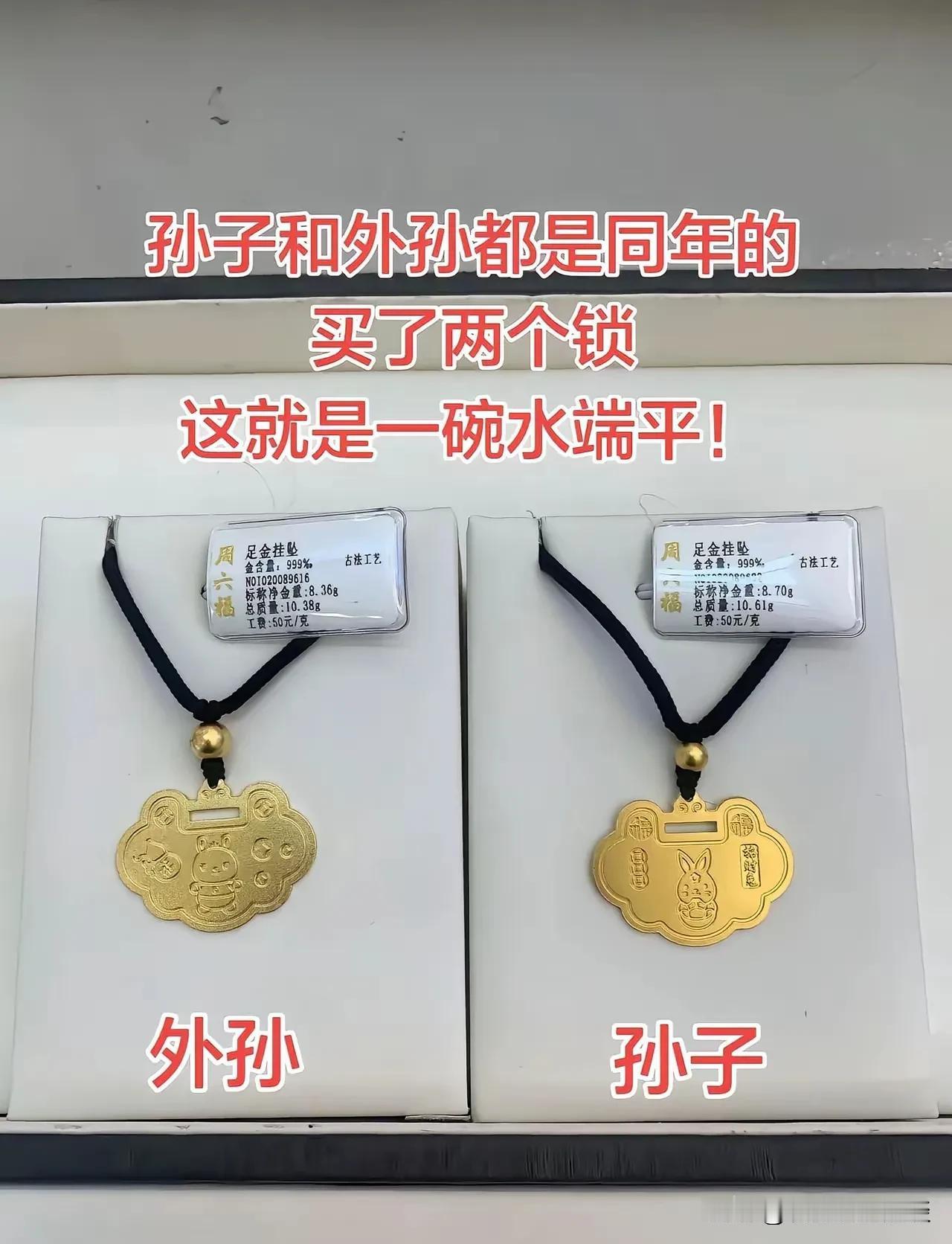 这老太太活得通透啊,在孙子和外孙同时过生日的时候,能做到一碗水端平。各买了一个铜金锁,孙子是8点7克,外孙的是8.36克,放到现在得1万多块钱啊。 这说明老太太有钱。他说外孙和孙子在他心目当中都是自己的孩子,她要尽量做到一碗水端平,两家不产生矛盾,不产生意见,一家人和和睦睦的。 能这么对外孙和孙子,公平对待的人不多啊。老奶奶金饰