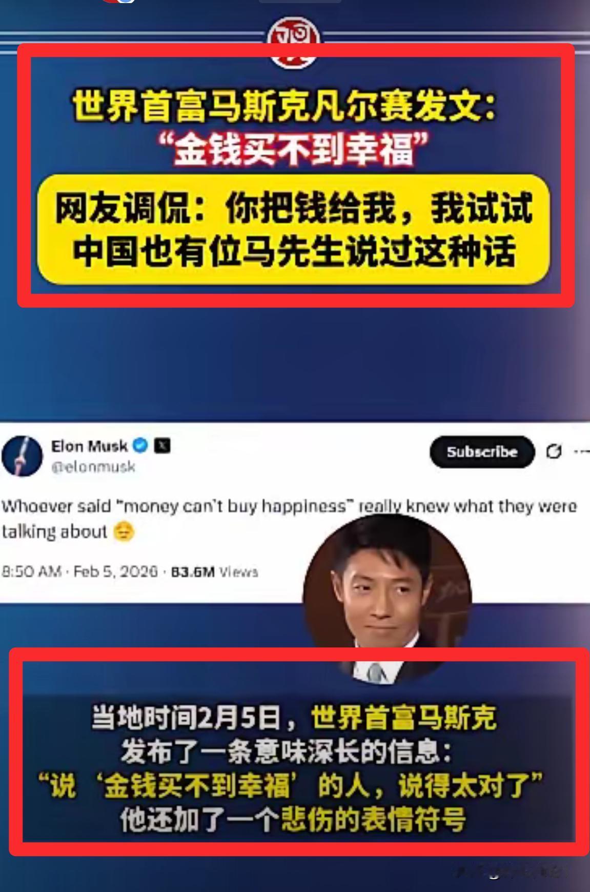 姓马的对钱都是如此看开?马斯克说,金钱买不到幸福!马云说,对钱没兴趣。 只能说人和人是不一样的。对有些人,金钱买不到幸福,有些人有了金钱,可以买到幸福。你觉得呢?欢迎评论。