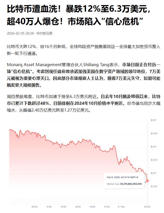 比特币的暴跌速度实在太快了,已经几乎抹去了特朗普上任以来“亲加密预期”带来的全部涨幅。 自从去年10月7日,在12.6万见顶之后,比特币实际上就进入熊市了,而且这轮熊市的见顶走势,和2021年非常的像,同样都是先闪崩,然后在低位横盘。 2021年见顶的时候,第一个阶段从7万跌至3.5万,跌幅50%,2022年的熊市,大饼从6万跌到1.5万,跌幅75%,相当于跌了2个50%。 那么2026年的熊市,开年就跌大跌12%,已经到了6.3万美元附近,比特币的熊市就是这样一步步摧毁市场信心,一点一点的击溃玩家的心理防线,最终无数人倒在了加密圈。