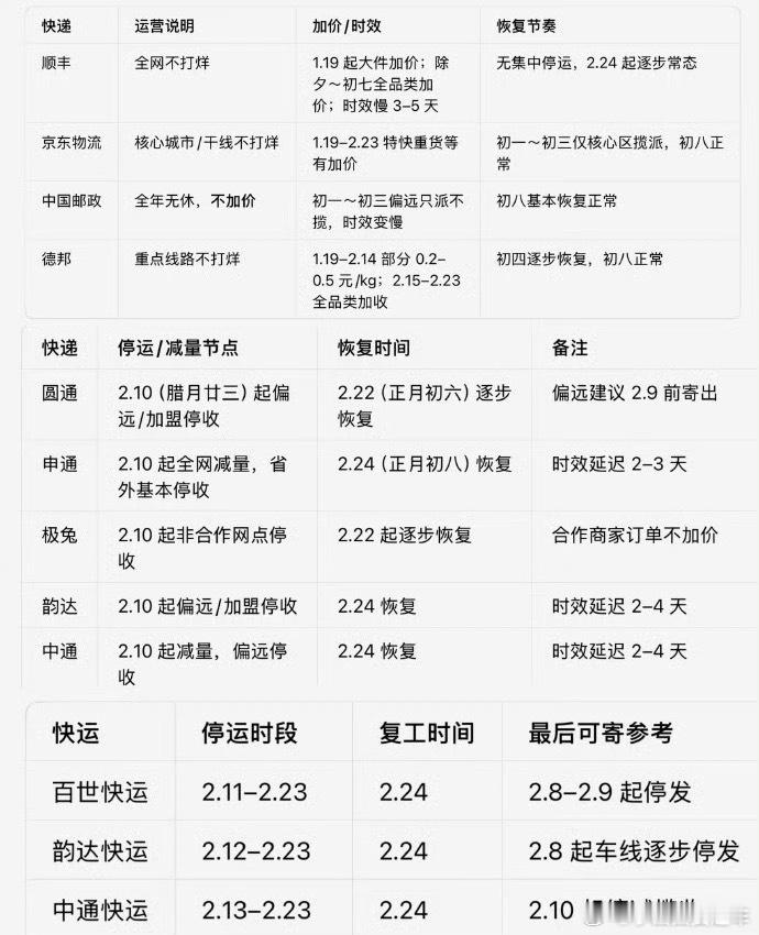 快递停运总结一下,顺丰+京东+邮政+德邦,春节不打烊其他快递基本2.10开始停收快件我这几天抓紧买买买了一波,心里踏实多了~你们过年准备买点什么呀?我看我还需不需要补点