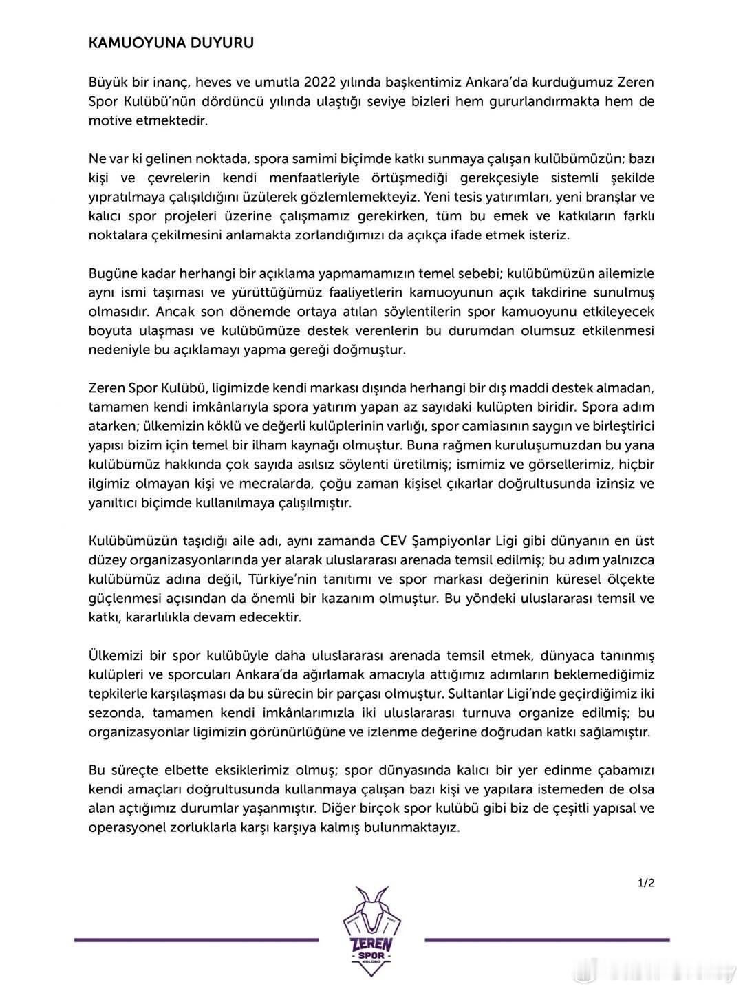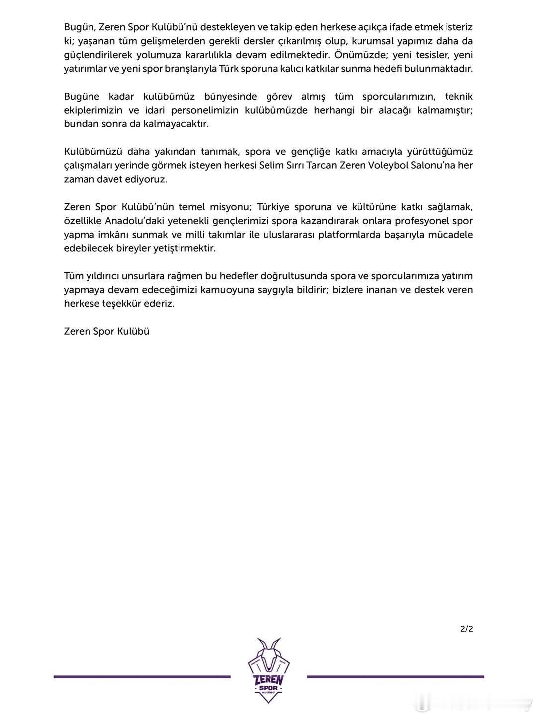 今天,我们想向所有支持并关注泽伦体育俱乐部的人士明确表示:我们从所有事态发展中汲取了必要的教训,正在通过进一步加强我们的组织架构,坚定不移地继续前行。我们的目标是:通过新设施、新投资和新运动项目,为土耳其体育事业做出持久贡献。