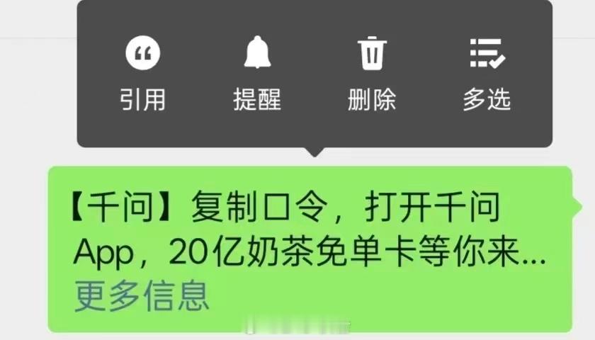 千问回应免费奶茶活动 既“元宝”红包分享链接被封之后,“千问”的免费奶茶分享口令也被微信封了