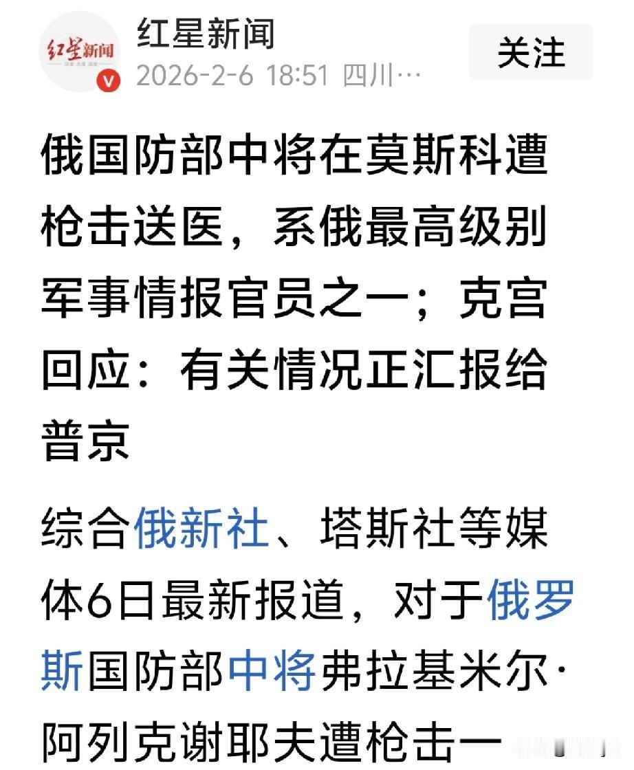 俄罗斯国防部一中将在莫斯科遭枪击。2月6日,现年64岁的俄国防部中将阿列克谢耶夫在莫斯科住所楼梯间被一男子连击数枪,枪手身份不明,开枪后逃离现场。警方已刑事立案,展开调查。 阿列克谢耶夫是俄最高级别的军事情报官员之一。在首都住所,暗杀这样一位高官,不是一个人、也不是一天两天可以做到的。说明俄罗斯情报工作漏洞很大,安全防范不到位,也说明有内奸配合。一而再再而三的发生类似事件,损失巨大,影响军心士气。不仅俄罗斯需要反思,我们也应该引以为戒,含糊不得! 莫斯科再遭袭击 俄军官被斩首 莫斯科遇袭事件 刺杀俄高官 俄高层遇袭 俄将领 俄罗斯少将遇刺