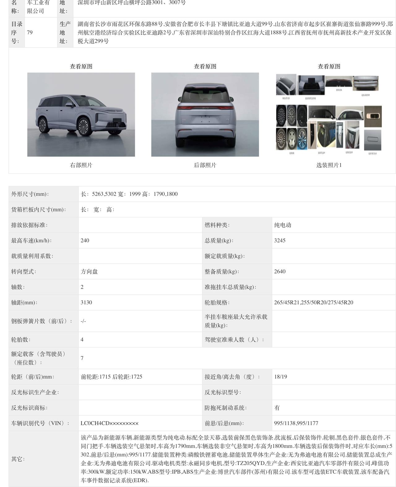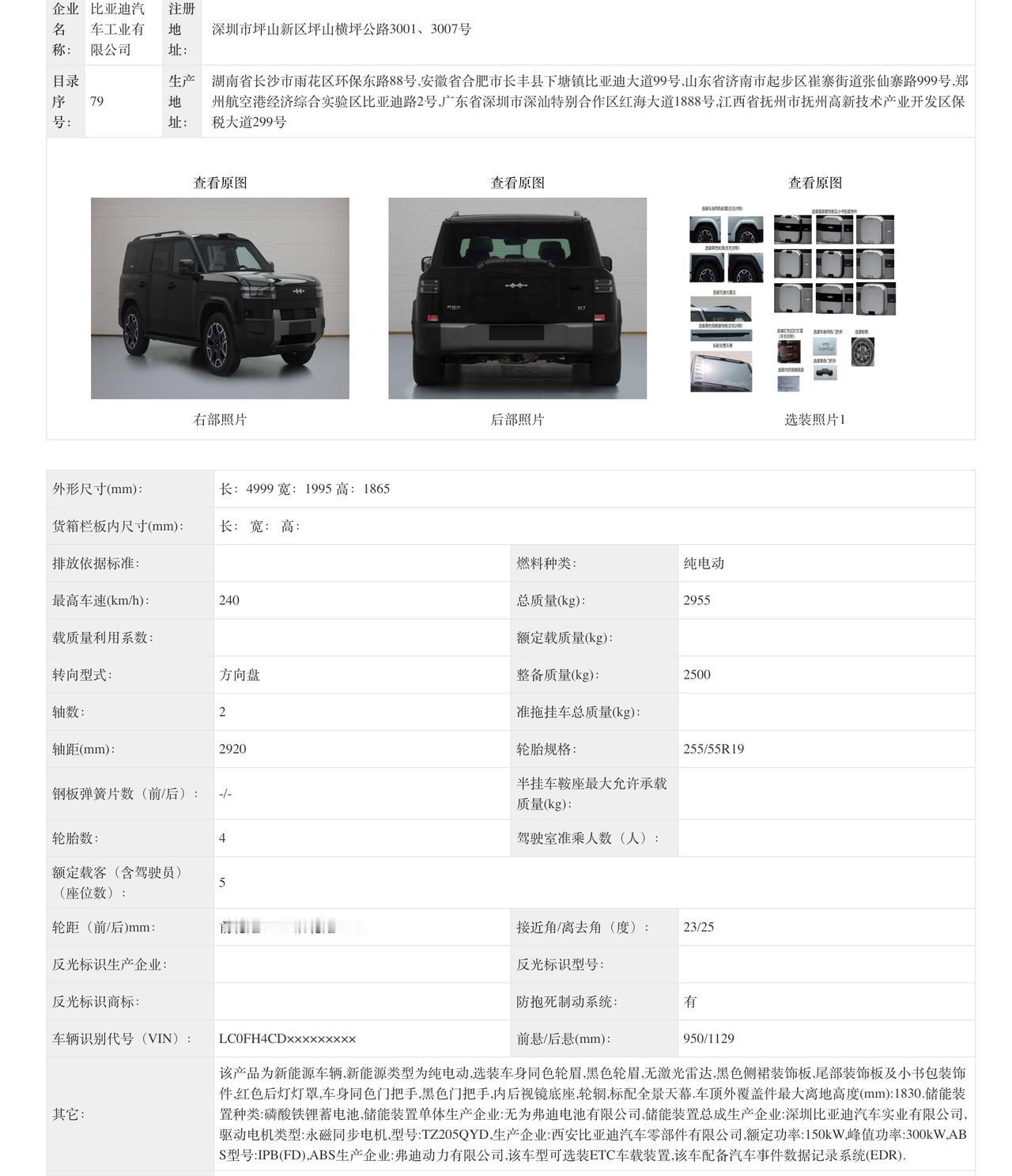比亚迪大唐申报信息: 5263/5302x1999x1790/1800mm,轴距3130mm 后驱版本300kw/370kw 四驱版本215kw+370kw 最高时速240km 标配兆瓦闪充 方程豹钛 7 纯电版申报信息: 单电机版功率 300kW 双电机版功率 215kW + 300kW 标配全景天幕,可选激光雷达、拖车钩