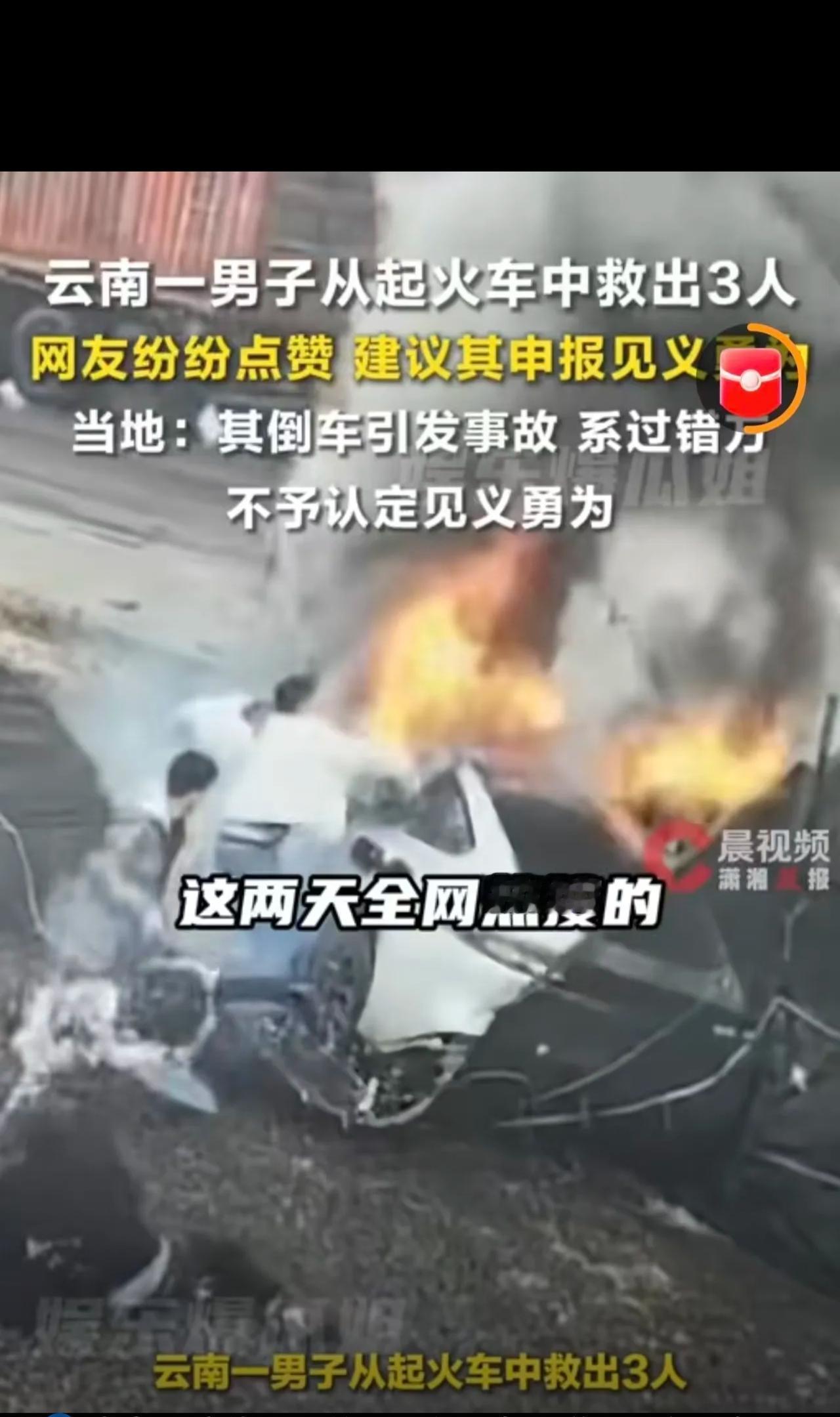 笑不活了!云南司机撞人后救3人,竟舔着脸申见义勇为?网友怒喷:要点脸! 云南文山这事儿,我被狠狠打脸了! 前几天刷到白衣大哥砸窗救人的视频,还跟着哭:火光冲天里拽出3个人,自己手烧得植皮,太伟大了! 结果反转来了——这大哥是全责肇事者!开货车违章倒车,直接撞上网约车起火,致1人遇难! 更讽刺的是,他直播只字不提撞车,光卖惨博打赏,赚得盆满钵满,还真敢申见义勇为? 官方直接驳回:肇事救人是法定义务,不算! 网友炸了: “先把人推火坑,再拉一把就当英雄?脸呢!” “我之前还打赏了,合着被当提款机耍?” “救3人该夸,但洗白肇事就恶心了!” 我真的气笑了:救人值得肯定,但这是你该做的啊! 你违章闯的祸,难道眼睁睁看着人烧死? 见义勇为是给无责英雄的,不是肇事者的遮羞布! 还好官方守住底线,不然以后谁都敢“先肇事再救人”蹭荣誉! 网络感动真不能盲目,你的善良可能只是别人的流量密码! 这事儿你站谁?欢迎骂醒我!
