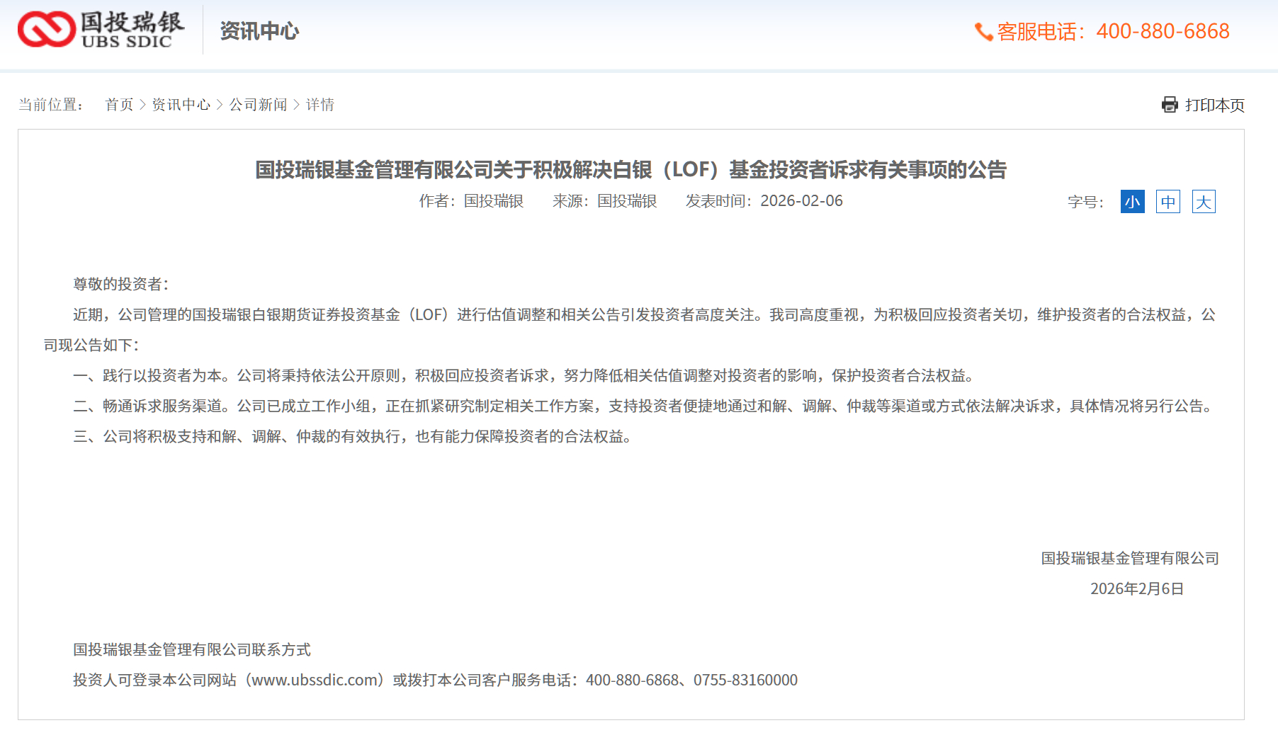 #国投瑞银基金成立工作组#【临时改规则后白银期货LOF单日暴跌31%,投资者集体投诉,国投瑞银回应】#国投瑞银白银期货单日暴跌31.5%##国投瑞银白银期货一周下跌超27%# 据国投瑞银基金管理有限公司(下文简称为“国投瑞银”)官网消息,2月6日,国投瑞银发布公告称,已成立工作小组,将积极解决白银(LOF)基金投资者诉求,包括和解、调解、仲裁等渠道或方式。