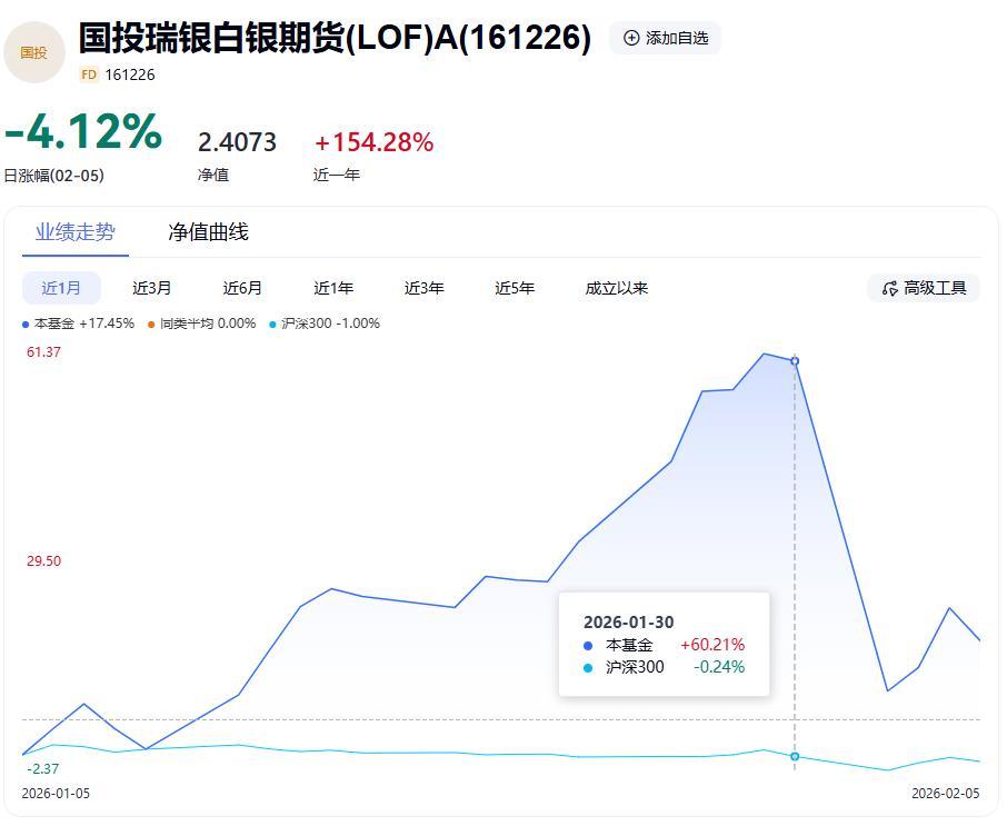1月30日,贵金属出现史诗级暴跌,金银价格创40年最大单日跌幅。现货白银价格盘中一度暴跌35.89%,截至收盘跌26.42%。而国投白银LOF当日净值下跌0.72%。