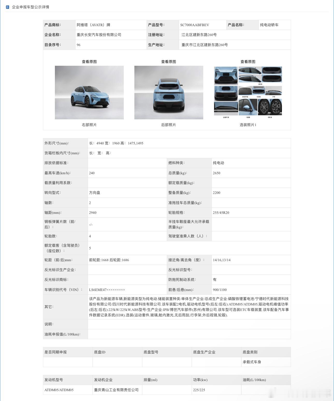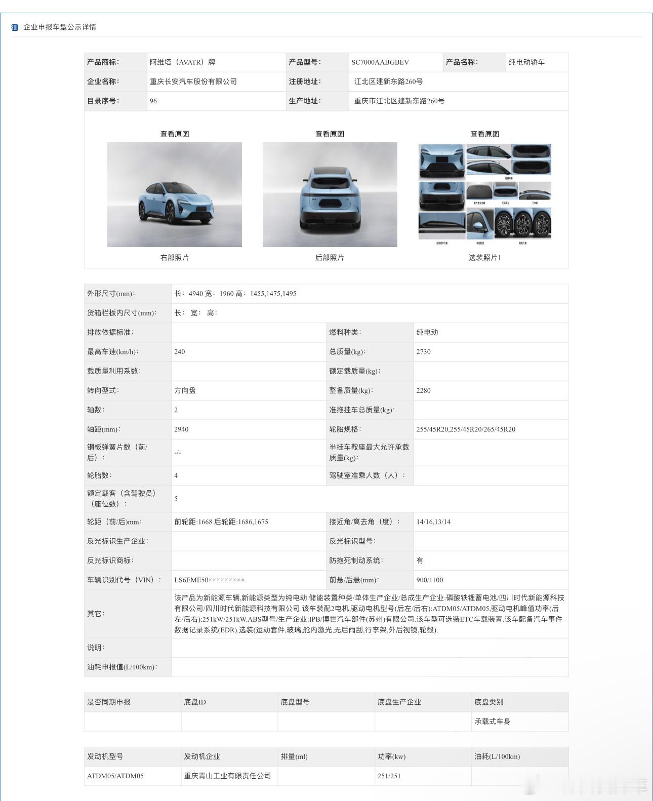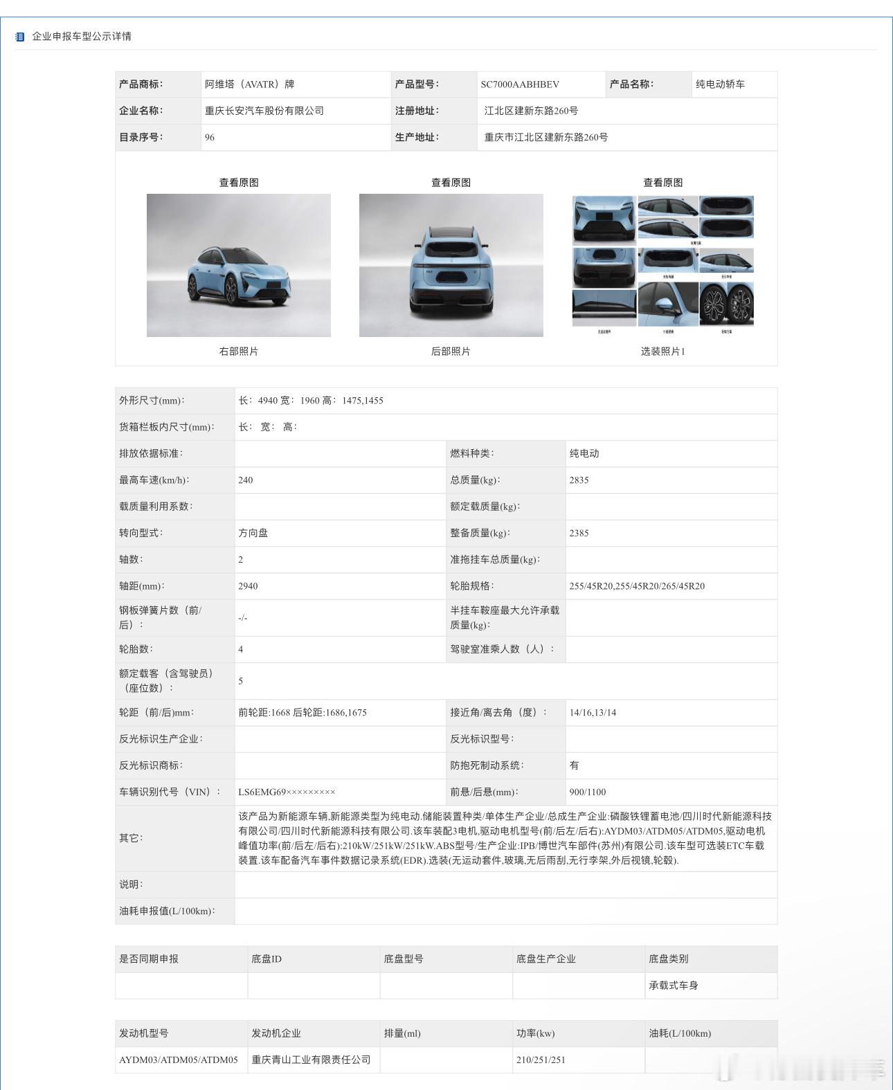 阿维塔 06T 同样申报纯电版、增程版双动力,尺寸4940×1960×1475/1495轴距2940mm,其中增程版电池容量45度纯电续航为245km,而纯电亮点是有210+251+251kW三电机版本。阿维塔06T新能源汽车