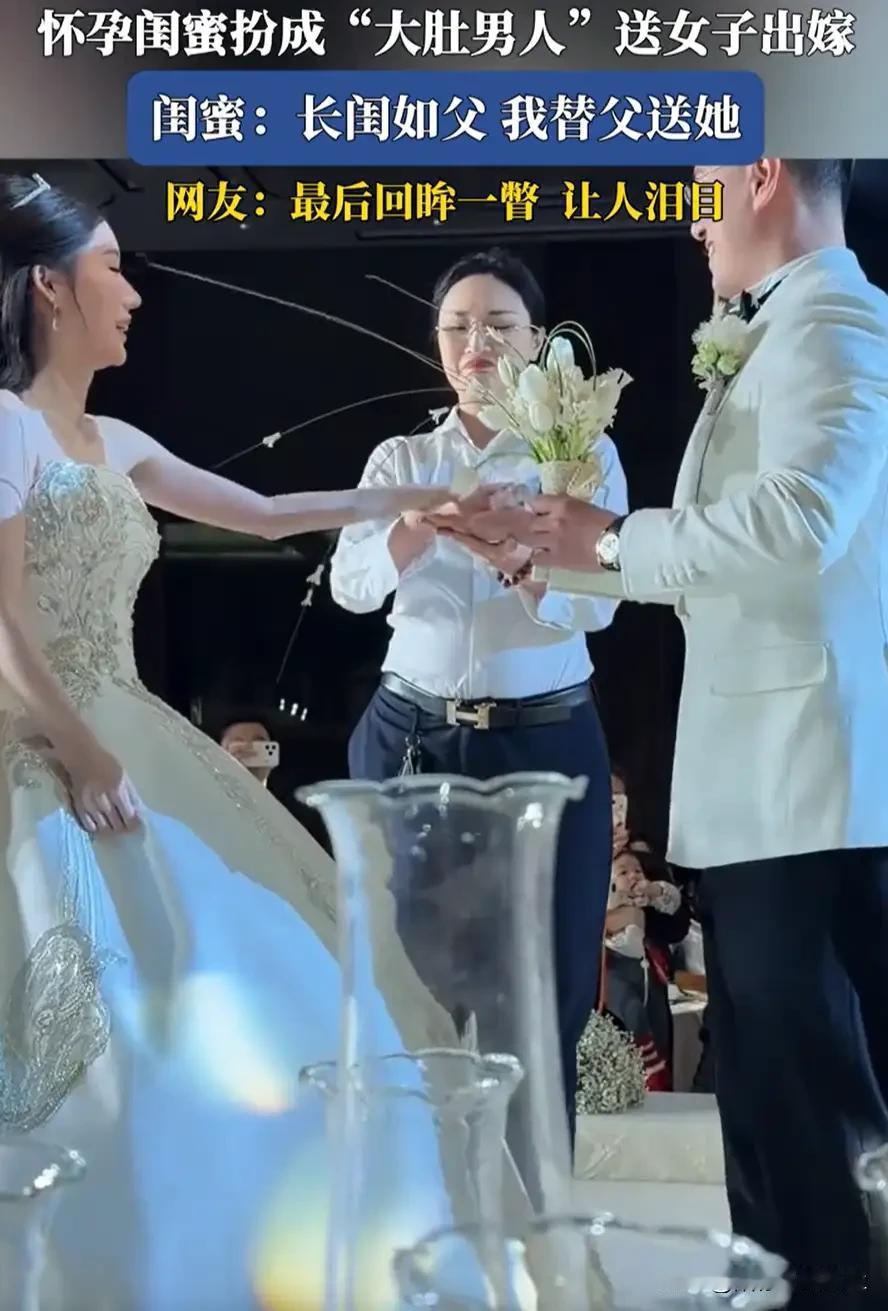 “太好哭了!”湖南,女生父亲去世,婚礼上闺蜜挺着孕肚,代替父亲送她出嫁:长闺如父,我替父送她。 谁说“防火防盗防闺蜜呢”?这位闺蜜真的能处!年龄大了,看不得这种场面,太好哭了! 2月5日,湖南一段婚礼现场视频的曝光,引发无数网友怒赞“好闺蜜”。 当婚礼进行中,一位穿着白色婚纱的准新娘,激动地把手伸向了款款而来的白衬衫女子。 远远望去,白衬衫女子一身中性打扮,至少已经怀孕六七个月,戴着佛珠手串,手里夹着一个公文包。 最细节的是,蓝色西裤上还配着条腰带,腰带上还挂着一串男士标配的“钥匙串”。 如果单从后面看,忽视前面,你一定以为她是“男人”,连那拽拽的步伐,全都学得维惟妙惟肖。 闺蜜将手递给了新娘,新娘牵起了她的手,有模有样地走向新郎。 这现场仪式感,真的不服不行啊! 原来,新娘的父亲已经过世,永远也来不了现场参加女儿的婚礼。 为了弥补这个遗憾,闺蜜挺身而出,充当了“临时父亲”这一角色,从而圆了新娘的仪式感。 评论区,不少网友在送上祝福的同时,也纷纷点赞这位“中国好闺蜜”。 有网友点赞道:将军肚,佛珠手串,夹个公文包,老爸6三件套。看得出来,这个闺蜜用心了! 也有网友表示:这是真闺蜜,这么用心打扮,是真心希望新娘幸福。看完视频很感动,知心朋友,总会在你需要的时候,出现在身边。 还有网友认为:怀孕不能参加婚礼,会给新婚夫妇带去小人是非,现在年轻人,一点儿忌讳都没有! 个人观点 看见有网友讨论地方习俗,认为怀孕就不应该参加婚礼,以免给新娘招惹是非。 个人觉得,婚姻是人生中的头等大事,没有哪个女生想马马虎虎举行,都渴望那种被对方捧在手心的仪式感。 因此,不应该太过注重小节,习俗是必须长辈到场,又怎么说呢? 希望新娘是嫁给了爱情,让父亲在天堂之下,也能心安! 你怎么看怀孕闺蜜,代替父亲送新娘出嫁? 内容来源:《河南民生频道》 女生父亲去世 闺蜜代替父亲送她出嫁