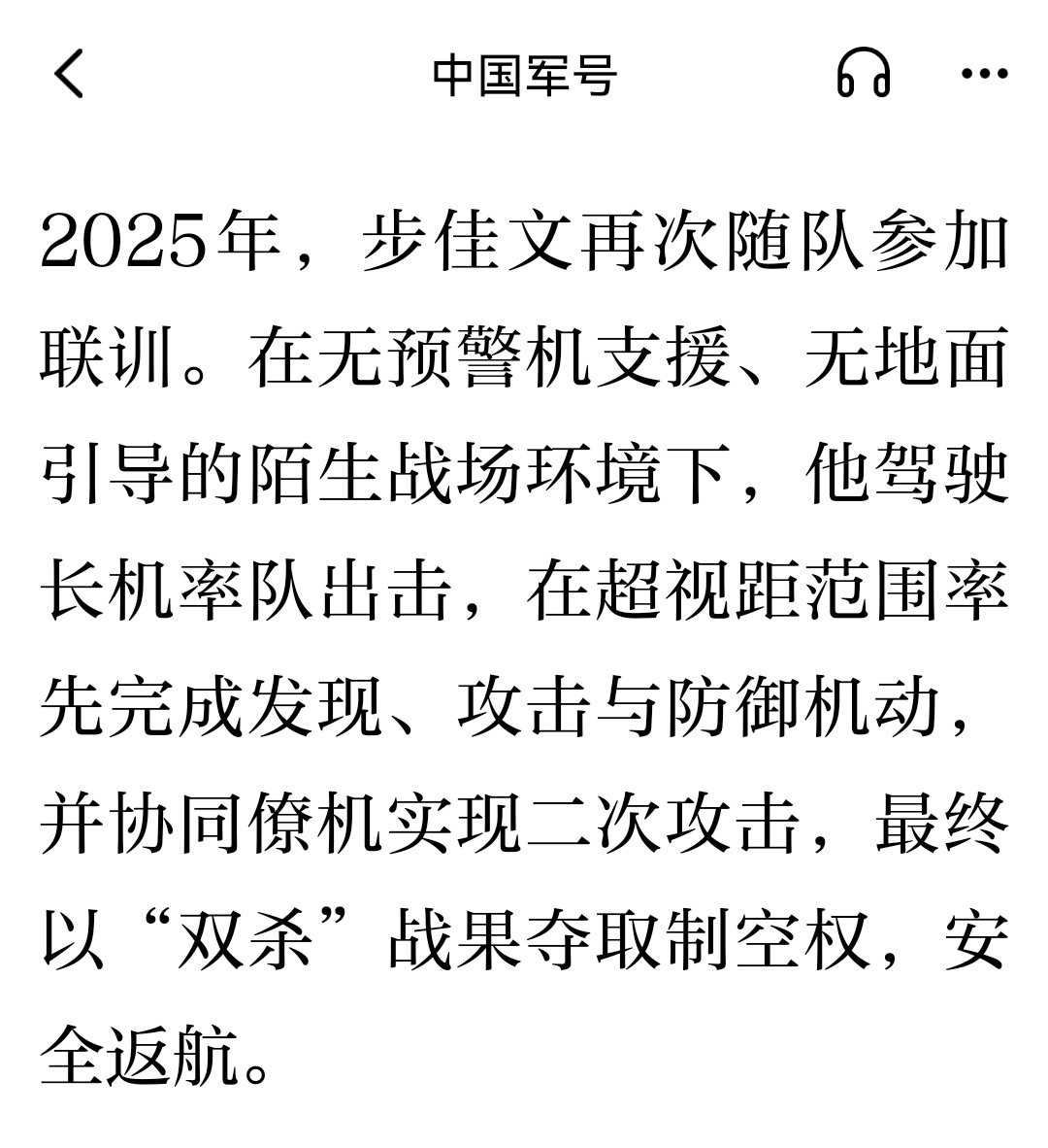 2025年,步佳文再次随队参加联训。在无预警机支援、无地面引导的陌生战场环境下,他驾驶长机率队出击,在超视距范围率先完成发现、攻击与防御机动,并协同僚机实现二次攻击,最终以“双杀”战果夺取制空权,安全返航。