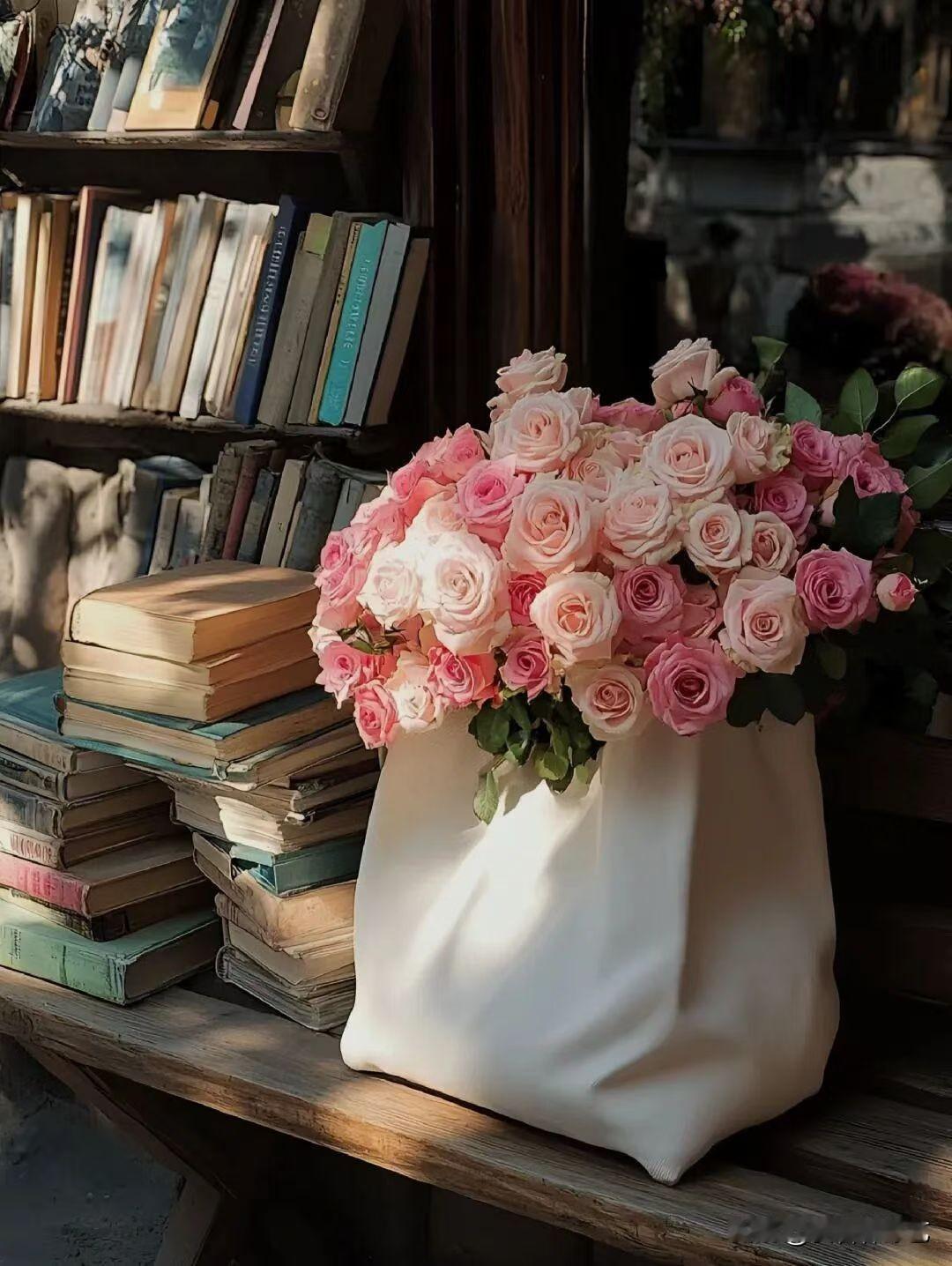 今年冬天的不同柔粉玫瑰裹着暖光,盛在素白袋里,旁侧旧书叠着时光的温软。书架漫出墨香,与花的甜意缠在一块儿,把闲静揉进这帧温柔里。