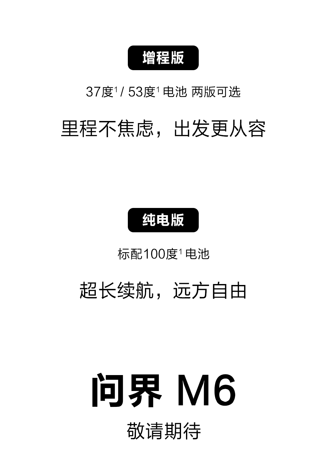 问界M6纯电版标配100度大电池 纯电版配100度电池,基于 800V 高压平台,后驱续航750km增程版则有两种电池包可选,37度和53度,1.5T 增程器热效率 41.5%,亏电油耗 4.2L/100km;37 度 / 53.4 度电池可选,纯电续航超 350km,综合续航 1300-1400km。鸿蒙座舱 5.0 + 麒麟芯片底盘:前双叉臂 + 后五连杆,CDC 可变阻尼悬架
