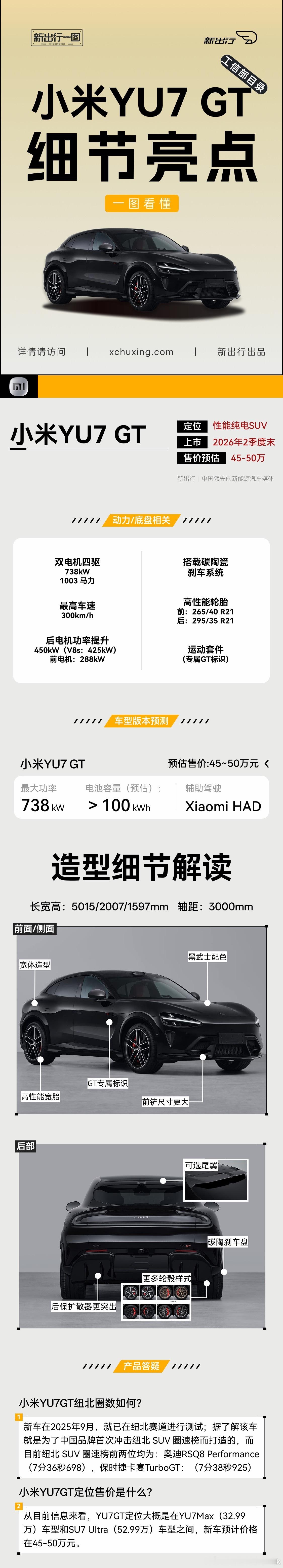 小米YU7GT要来了!不仅是帅那么简单,看了下配置,千匹马力,碳陶刹车,大宽体+大宽胎,前部尾部进行重新设计,更运动化,还有侧面尾部GT标识!对比YU7Max在性能方面升级了不少东西啊!