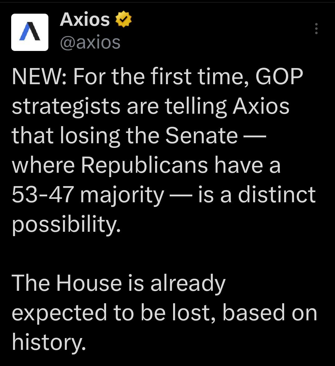 吐槽版新闻快讯——【共和党药丸?这次连自家军师都慌了】 家人们,活久见!Axios最新消息,共和党内部的战略家们终于绷不住了,首次承认他们不仅大概率要输掉众议院,连目前以53-47优势把控的参议院,现在也岌岌可危。 要知道,历史数据本来就预示着中期选举执政党会很惨,所以丢众议院大家早有心理准备。但现在连“基本盘”参议院都要保不住,这就相当于医生告诉你:“病人不仅有糖尿病,现在还查出了心脏病。” 合着特朗普带飞的2022年红利,这么快就吃完了? 共和党人现在的心情,大概就像手里抓着一把同花顺,结果发现对手的牌是王炸。 只能说,内斗一时爽,选举火葬场啊! 消息来源Axios