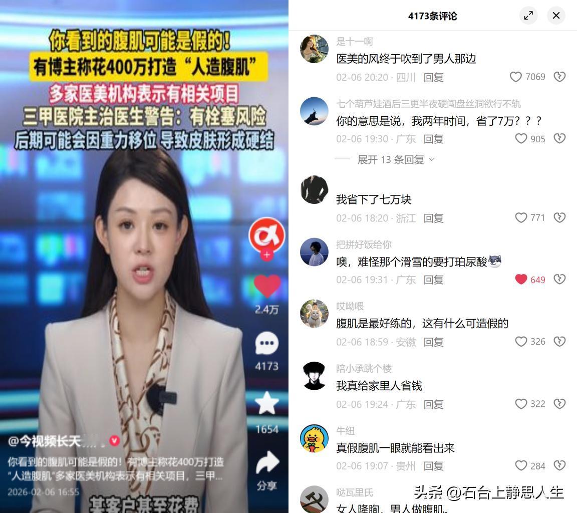 有人花400万做人造腹肌 这钱不光砸在腹肌上,还得算上肩膀、胸肌等多部位的玻尿酸注射打包价。医生早警告过,大量注射有栓塞风险,后期还可能因重力移位形成硬结,长期下来甚至会压迫原生肌肉萎缩。 大家一边调侃省了7万,这是普通人做人造腹肌的市场价,一边更认死理:健身才是真划算,0成本不说,练出来的是实打实的肌肉,线条自然还能增益健康。 这事儿折射出当下的一个小陷阱:不少人总想着用钱换捷径,不想花时间流汗,只想一步到位要光鲜结果。可捷径往往藏着坑:医美效果是临时的,风险是实打实的;而靠汗水攒出来的东西,才是能留一辈子的底气。 换作是你,会选花钱买假线条,还是花时间磨真肌肉?