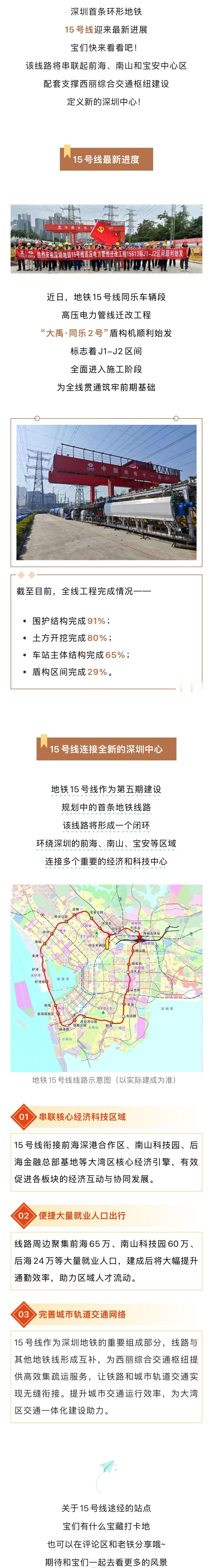【深圳首条环形地铁 15号线迎来最新进展!】该线路将串联起前海、南山和宝安中心区,配套支撑西丽综合交通枢纽建设,定义新的深圳中心!近日,地铁15号线同乐车辆段高压电力管线迁改工程“大禹·同乐2号”盾构机顺利始发。