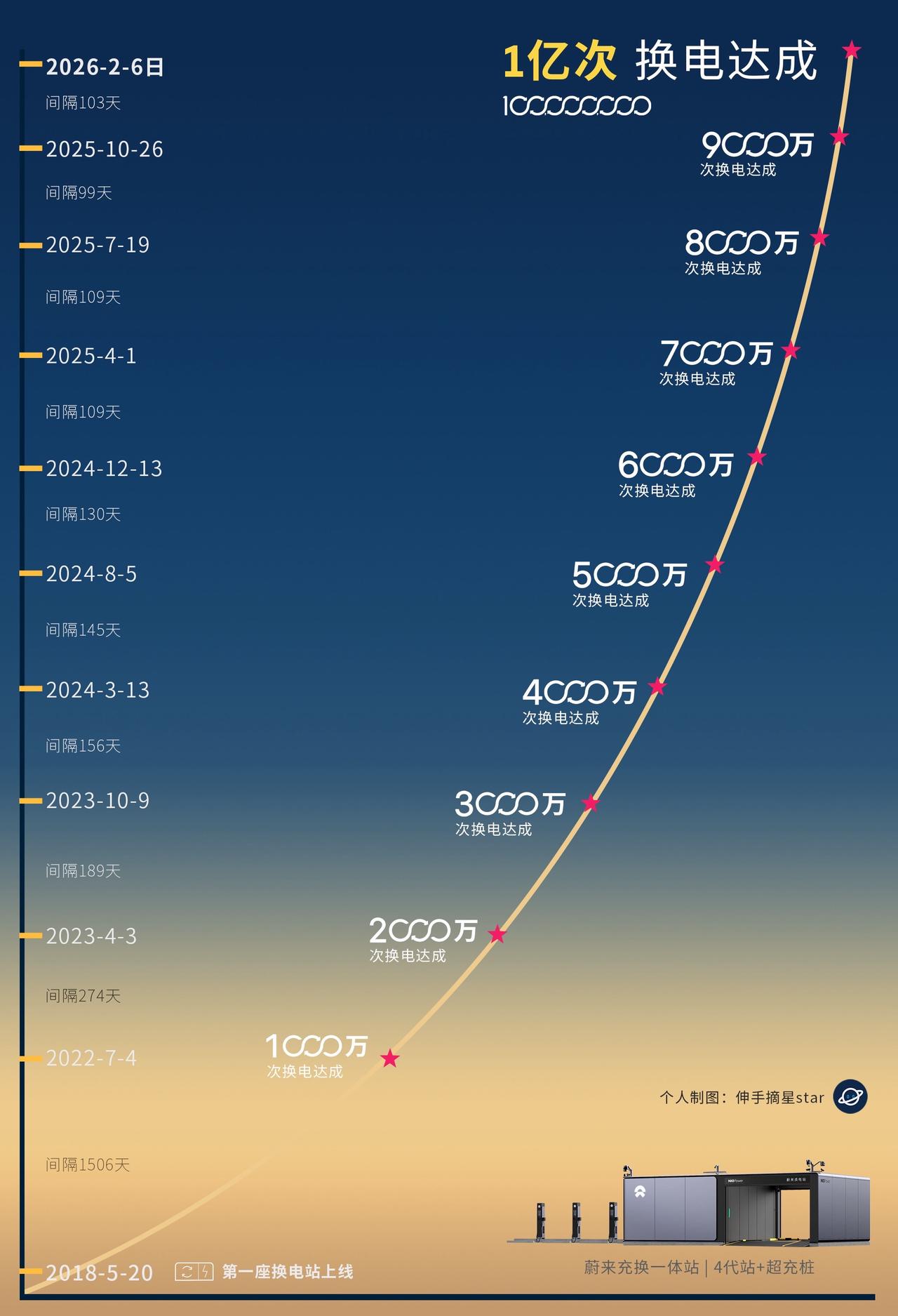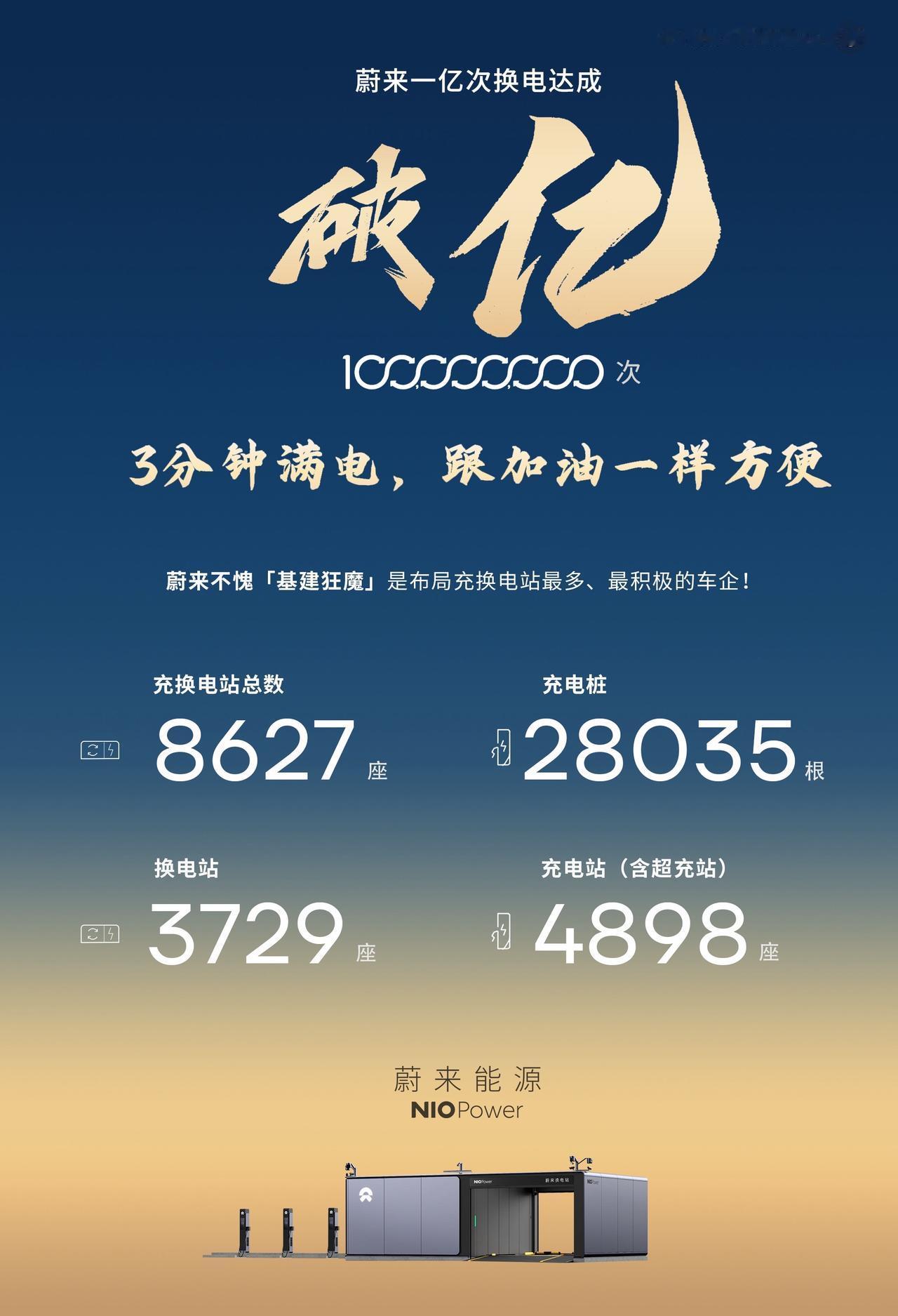 蔚来投入换电8年, 今天累计换电破亿次! 这是蔚来换电里程碑的一天。 这是里程碑的意义, 换电以后都是以亿次为底色。 换电只有0次与一亿次以上。 都说蔚来是车企基建狂魔: 坚持投入基建180多亿, 8627座充换电站 3729座换电站,其中高速1019座! 蔚来的28035根充电桩对公众开放。 蔚来的换电模式也是开放合作的。 蔚来也是全球维二的坚持纯电的品牌。 蔚来换电去哪都方便 蔚来换电一亿次 蔚来 新能源汽车