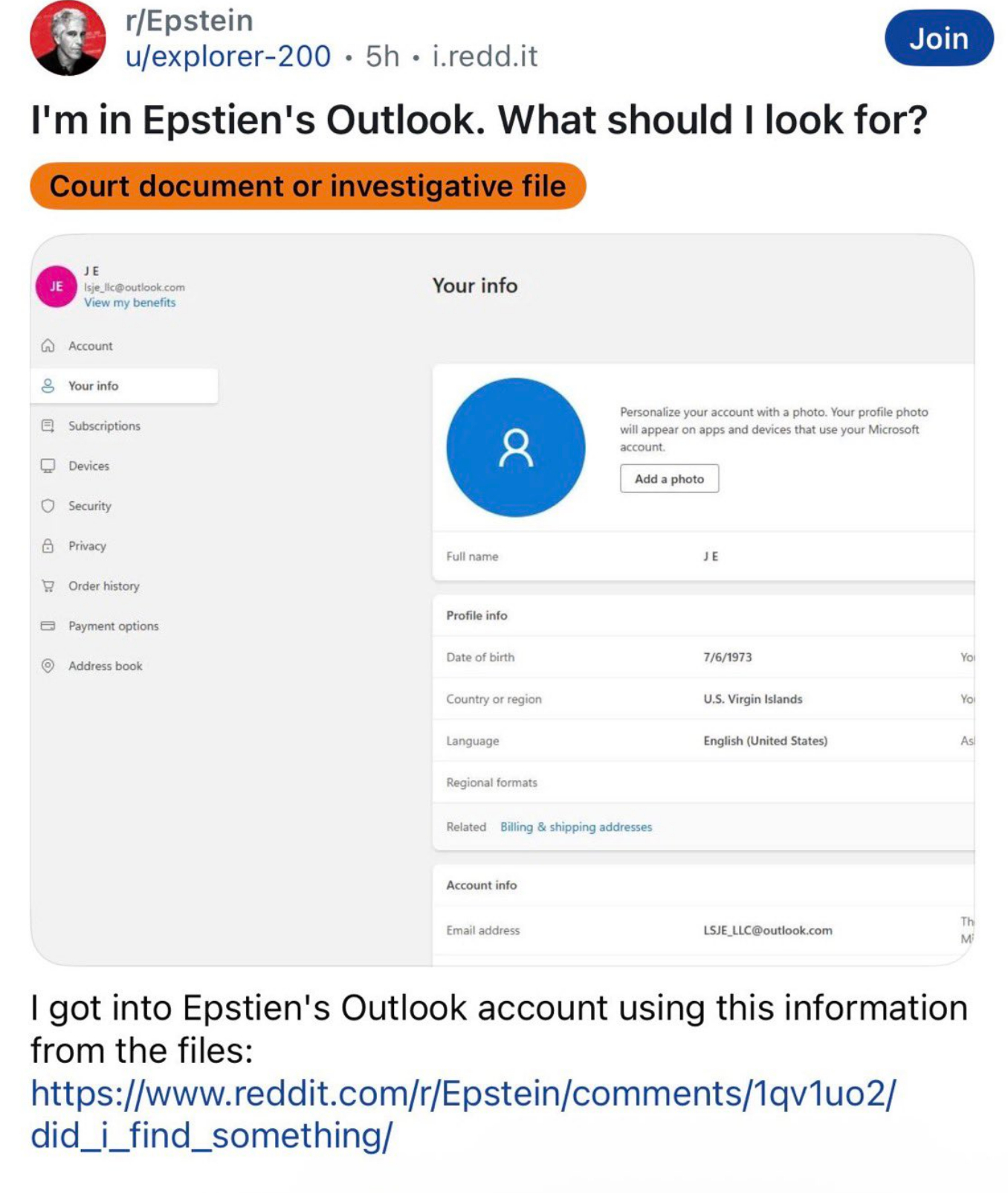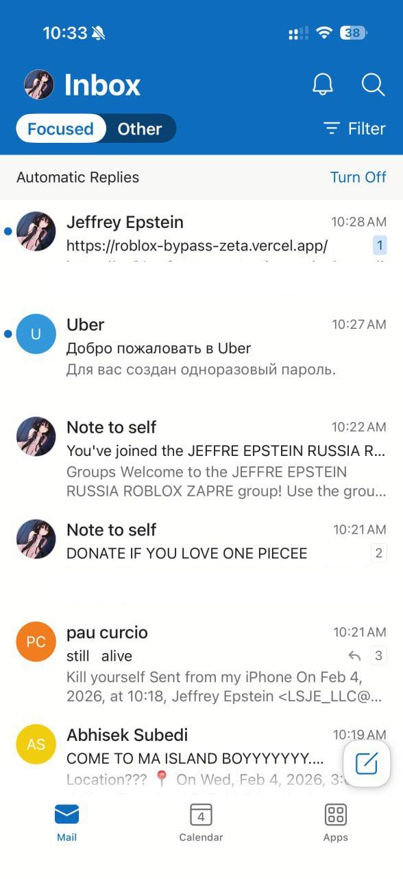 🔻一位 Reddit 用户利用官方公布文件中找到的信息,率先成功登入了爱泼斯坦的 Outlook 账户。🔻他公布了整个方法,爱泼斯坦的 Outlook 密码是 1Island。🔻于是一发不可收拾。🔻现在账号中充斥着各种表情包字母,许多用户试图在账户上添加二刺猿头像,头像一度还被改为了孙笑川。爱泼斯坦死亡当晚离奇细节曝光爱泼斯坦死亡当晚监控曝光热点现场海外新鲜事