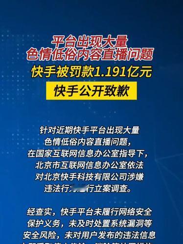 2月6号,北京互联网信息办对快手公司立案调查后,认定快手平台出现大量色情低俗内容直播问题,依据相关法律法规对快手公司处警告、罚款1.199亿元的处罚! 大快人心!罚得好!还罚少了点,应该多罚,罚到它肉痛!快手有这种问题不是一天两天了,几乎成了色情平台的代名词,为了流量、利润,快手几乎没下限,很有纵容色情低俗内容的故意。老喊与国际接轨的精英们,怎么不在这种问题上学学西方,不是这么点小钱罚罚了事,它几个月就赚回来了,而是罚它个几十上百亿,真让它疼到了才行,约谈负责人也是不痛不痒,罚了公司还要罚法人、高管本人,才能让这帮利益熏心的家伙收敛! 违法成本过低一直都是大问题,国家应该给予重视!