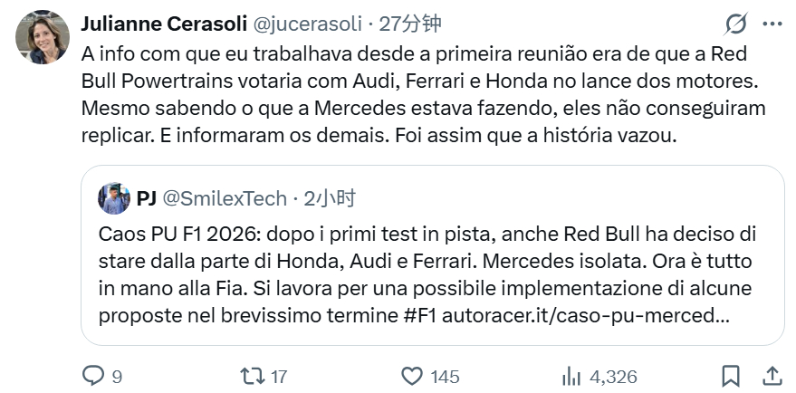 巴西名记Julianne Cerasoli转发了Autoracer新闻并写道: