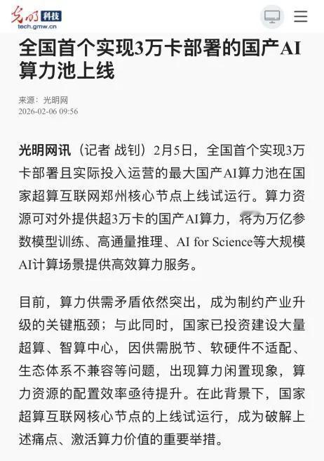 央媒点名的含金量,你看懂了吗? 最近行业群里有个光明网的报道被转了好几次,标题挺提气的《全国首个实现3万卡部署的国产AI算力池上线》。好家伙,“首次实现”、“3万张卡”、“超大规模”,这几个词摆在一起,份量就不一样了。这可是央媒给的一次很关键的“点名”。 咱们内行人看,这个“首次”背后的门道在哪?我觉得,它不仅仅是指规模上了一个数量级,更重要的是,它标志着我国超大规模智算集群的“系统工程能力”和“持续运营能力”通过了实战检验。简单说,就是从“能搭起来”到“能稳定用起来”的一次关键跨越。 报道提到该节点采用的曙光scaleX万卡超集群基于AI计算开放架构,可全面兼容CUDA等主流软件生态,支持多品牌国产加速卡混合部署,具备向十万卡、百万卡规模的灵活扩展。而且已完成400多个主流大模型、世界模型的适配优化,依托国家超算互联网实现一体化算力调度,可接入上千款应用。 这说明,我们不仅有能力集成庞大规模,更有能力让这个庞大系统在开放、兼容的状态下高效运转,这才是真正的体系化实力。 央媒的这个定调,等于是在行业里程碑上刻下了一笔。它告诉外界,中国在AI算力基础设施这场耐力赛里,已经具备了全球一线的建设和运营能力。中科曙光 超算互联网