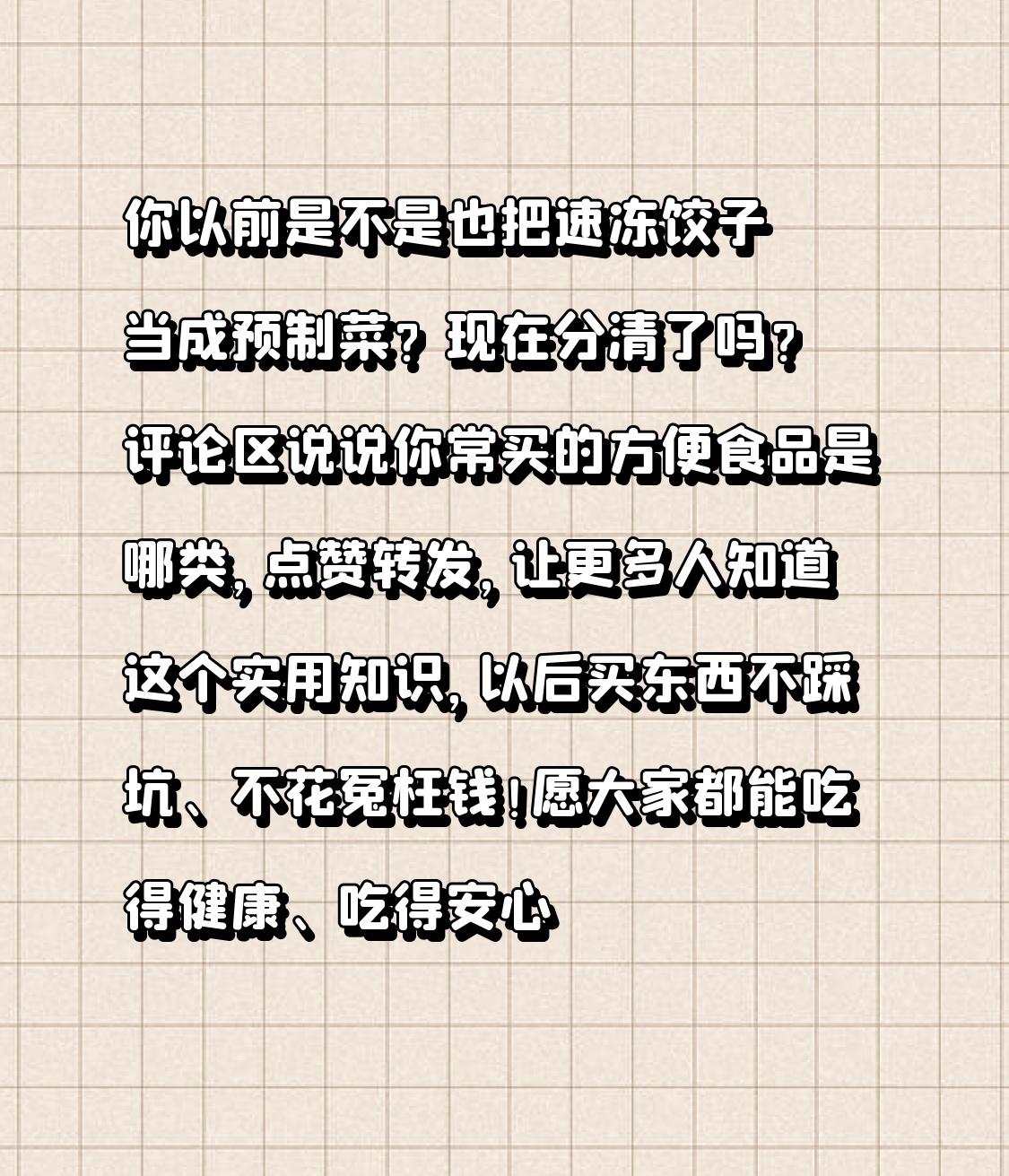 家人们!逛超市买速冻饺子被当成预制菜?吃开袋即食的鸡胸肉担心有防腐剂?2026年预制菜首个国标正式实施,78%的人还在混淆概念,花冤枉钱不说,还可能误食不合格产品!今天一次性说清:这4类食品根本不算预制菜,国标已经明确划界,看完再也不踩坑! 前几天我妈去超市,拿着速冻包子问导购“是不是预制菜,有没有防腐剂”,导购支支吾吾说不清楚,最后只能放弃购买。相信很多人都有同款困惑:超市里的净菜、即食鸡胸肉、连锁餐厅的菜,到底算不算预制菜?以前市场混乱,商家随便标注,消费者只能靠猜,现在国标落地,终于有了明确答案! 先搞懂核心:国标定义的预制菜,是“经工业化预加工、不添加防腐剂、需加热或熟制后食用的预包装菜肴”。而这4类食品,完全不在此列,以后别再搞混了! 第一类是主食类,比如速冻饺子、包子、馒头、盖浇饭。这些食物侧重碳水供给,有专属国标《GB 19295》管控,和预制菜的“菜肴属性”完全不符。以前总有人担心速冻饺子是预制菜有防腐剂,其实正规产品靠低温冷冻保鲜,根本不需要添加,放心买就行! 第二类是净菜类,超市里洗净切好的土豆丝、胡萝卜块、生菜等。这些只经过清洗、分切,没做任何工业化烹饪,本质还是“食品原料”,符合《GB 2762》农残标准即可。像我这种上班族,买净菜回家直接炒,既方便又新鲜,比预制菜更能保留营养。 第三类是即食类,比如火腿肠、泡椒凤爪、即食鸡胸肉。这些开袋就能吃,不需要加热,和预制菜“需复热食用”的要求相悖,有各自的安全标准管控。但要注意,即食类可能含防腐剂,买的时候看配料表,选择添加剂少的更健康。 第四类是中央厨房菜品,比如西贝、海底捞配送门店的半成品。这些是连锁餐饮内部配送,相当于“门店自有厨房的延伸”,不算市场流通的预制菜,但如果门店外购预制菜再加工,就必须符合国标。以后去连锁餐厅吃饭,不用再担心“吃的是预制菜”,人家的中央厨房菜品有专门规范。 但转折点来了,国标落地后,仍有不良商家钻空子!比如把含防腐剂的料理包当预制菜卖,或者把预制菜加热后冒充现炒菜,价格翻3-5倍。教你3个避坑技巧:一看标签,必须明确标注“预制菜”和食用方式;二看配料表,有苯甲酸钠、山梨酸钾等防腐剂的直接pass;三看保质期,预制菜最长不超过12个月,超期的别买。 其实大家纠结“是不是预制菜”,核心还是担心安全和营养。现在国标明确要求预制菜零防腐剂、减油减盐减糖,靠冷链和先进工艺保鲜,正规产品完全可以放心吃。而我们分清这4类非预制菜,也是为了根据需求选择:想方便快捷选预制菜,想新鲜营养选净菜,想省事选主食类,想即时补充选即食类。 饮食的本质是健康和舒心,不管是预制菜还是其他食品,只要选对渠道、看清标准,就能吃得放心。国标给我们划清了界限,也让市场更规范,这才是最实在的保障。 你以前是不是也把速冻饺子当成预制菜?现在分清了吗?评论区说说你常买的方便食品是哪类,点赞转发,让更多人知道这个实用知识,以后买东西不踩坑、不花冤枉钱!愿大家都能吃得健康、吃得安心~