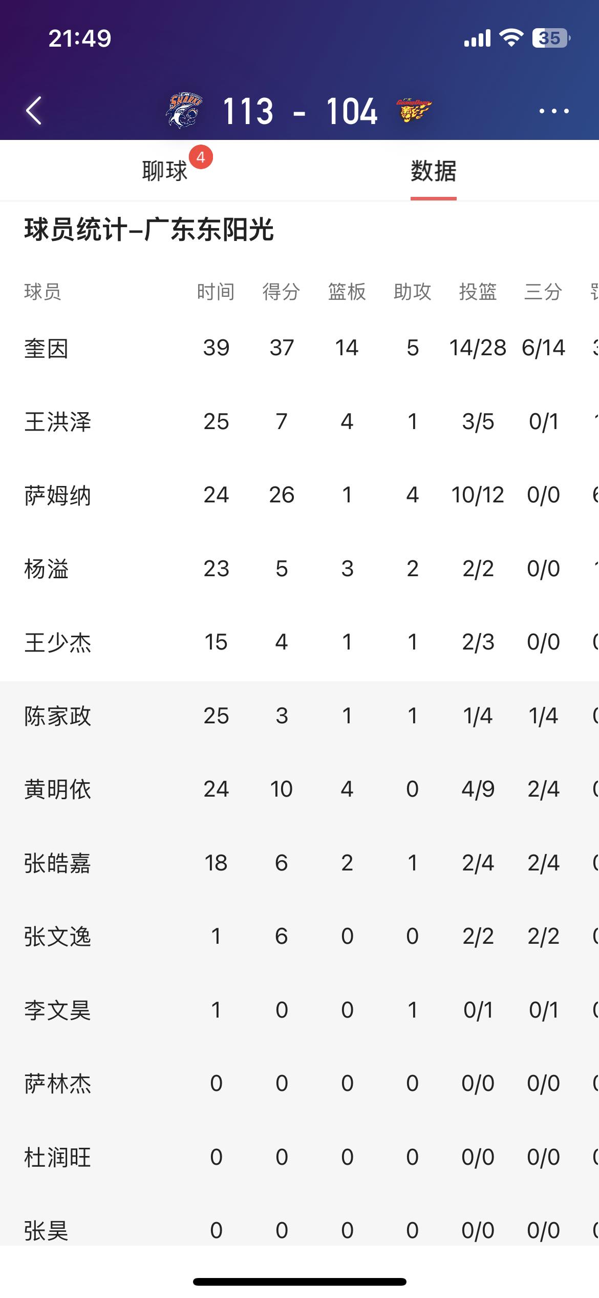 广东和上海两队各取所需,上海队取得胜利,广东队锻炼了队伍,今晚广东队的小老虎们打得都挺好,可以说这是最近广东队打得最好的一场比赛,虽然比赛输了,也是要给他们点赞[赞][赞]! 黄明依,王洪泽,杨溢,张皓嘉,陈家政在两小外援奎因和萨姆纳的带领下,打得都很积极主动,特别是黄明依,有多久没有打正式比赛的他,今晚让人眼前一亮,他抓住了少有的机会,让自己发光发热,相信杜峰也会看在眼里,在下一阶段会给他一些上场时间的,今晚广东队的年轻人,没有了依靠,只有依靠自己,敢打敢拼,没有畏畏缩缩,打得都很主动,值得表扬! 这场比赛,广东队就是来走个过场,就让两个小外援带着一帮年轻人打,萨林杰休息,根本就没想过能赢,也不可能赢,因为赢了比赛,下一场也没有人打了,所以就赶紧打完回广东了。但是这些人,就连杜峰都没想到能打得这么好,可能是心态放松,球员发挥的也会比较好吧,不管怎么样,第一阶段的比赛总算全部结束了,广东队缺兵少将😰情况下,依然能取得第三名的好成绩,这也是很难得的,下一阶段,广东队会迎来小崔和麦考尔的复出,阵容更加完整的广东队一定让我们眼前一亮的!