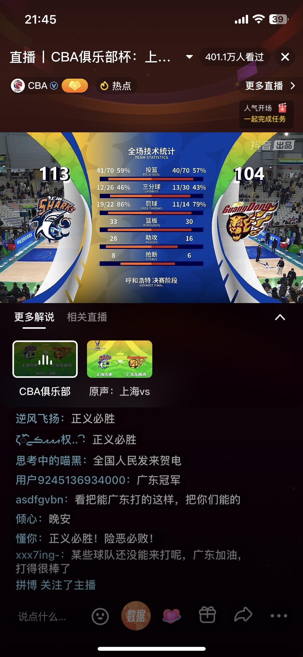 广东和上海两队各取所需,上海队取得胜利,广东队锻炼了队伍,今晚广东队的小老虎们打