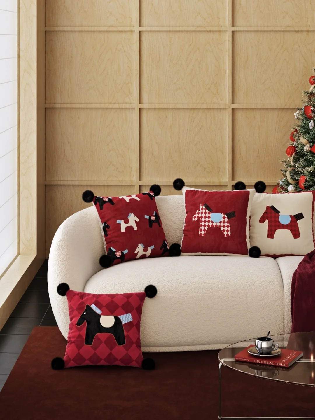 正红底色抱枕 恰好烘托出冬日的暖意 棋盘格纹简洁利落 与立体小马轮廓悄然呼应 边缘缀着一圈蓬松毛球 细腻柔软的触感 让每次触碰都心生欢喜 米白色线条轻轻穿插 也添了几分安静松弛 可放置在沙发角落 或静卧窗台边 若搭配红色绒毯、三两节日挂饰 便在家里晕开淡淡的喜庆 -