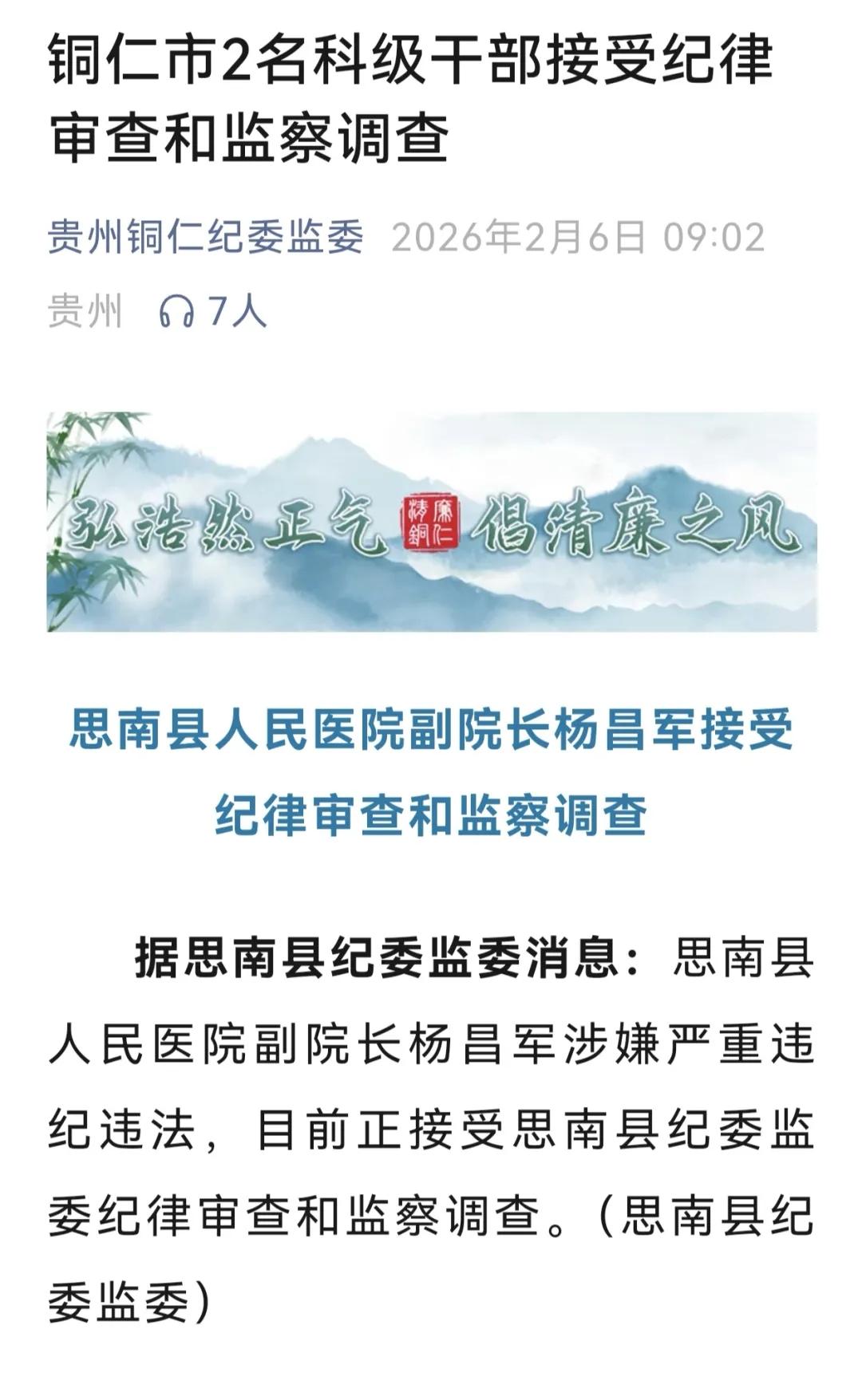 思南县人民医院的杨昌军,今天彻底栽了。 这个杨昌军也不简单,网上关于他的公开资料很少,出生年月不详。 但是从官网发布的照片来看,他的身材较瘦,长相也是比较斯文,从外貌来看,年龄应该在45岁左右。 他在2004年就从贵阳医学院临床医学专业毕业,毕业之后,便来到了思南县人民医院工作,算了一下,到如今为止,他在思南县人民医院已经工作22年。 从一名住院医师一步一步晋升为思南县人民医院神经内科主任,神经消化外周介入科主任,医院副院长。尤其是在晋升医院副院长之后,主要分管医疗业务,设备采购及科研项目。每一个分管区域都是医院里的大资金核心岗位。 其本人作为神经内科的一把手,在治疗疾病的时候,尤其擅长脑血管病的诊断及治疗,还有急性脑梗死的静脉溶栓及机械取栓治疗。 任职期间长期从事住院医师、规培生、进修生管理及教学工作。 2007年在广西桂林学习软通道颅内血肿清除术。 2010年在浙江省台州市立医院进修学习神经内科。 2014年在遵义医学院介入放射科及脑血管病科进修学习。 2020年完成市级科研项目《尿激酶联合替罗非治疗急性脑梗死临床研究》。 发表省级以上论文10余篇。 纵观他的履历,也是颇为光鲜,没想到在走上管理岗位之后,渐渐忘却了初心,萌生了贪腐之意,伸出了贪腐之手,触碰了法律红线,如今栽倒在了任上,确实令人唏嘘。 杨昌军作为基层医院的管理者,本应该在履职期间,廉洁职守,克己奉公,很显然他并没有做到,他的落马,也再次彰显了国家清除医疗系统蛀虫,维护医疗公平的坚定决心。 医疗体系的健康发展,关系到每一个老百姓的切身利益。唯有通过持续深化改革,完善监督体系,才能让基层医院成为守护群众健康的坚实屏障。